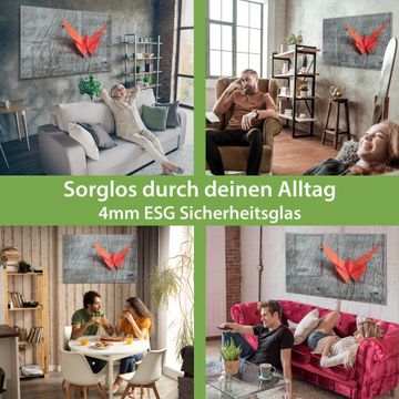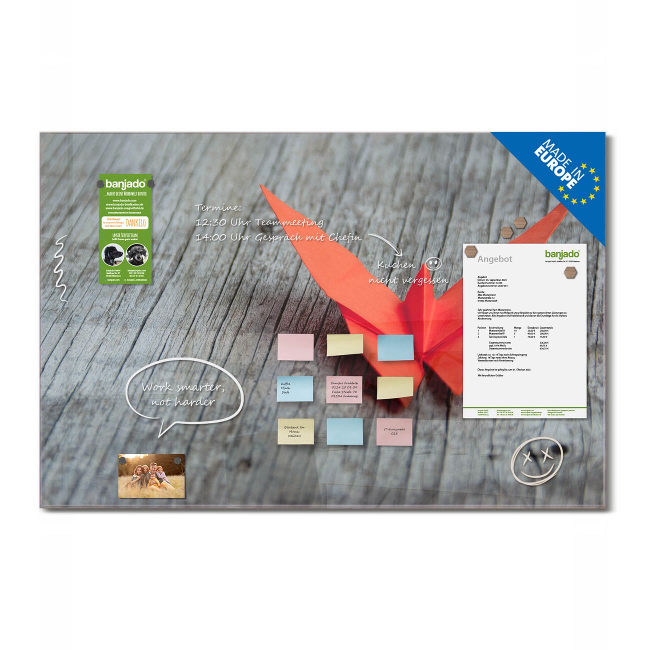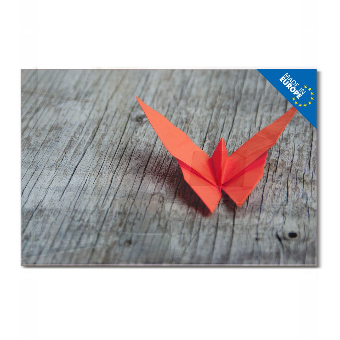 Material: 4mm Sicherheitsglas mit Metallrückwand Eigenschaften: beschreibbar, magnetisch, kratzfest Maße: 120x80x0,6cm, 14,40kg schwer Motiv Nummer 10272 Origami Schmetterling Zubehör: inklusive 4 Neodym-Magnete