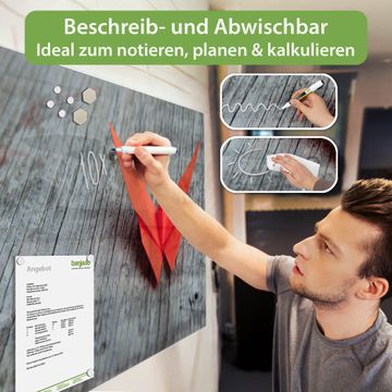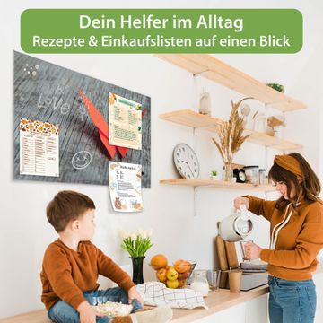 Auf der glatten Glasoberfläche lassen sich Termine, Rezepte oder Notizen ganz einfach mit Kreidestiften festhalten und rückstandslos entfernen. Starke Neodym-Magnete halten Ihre wichtigsten Erinnerungen sicher an Ort und Stelle. So entsteht Ihre ganz persönliche Ideenwand - jeden Tag neu.