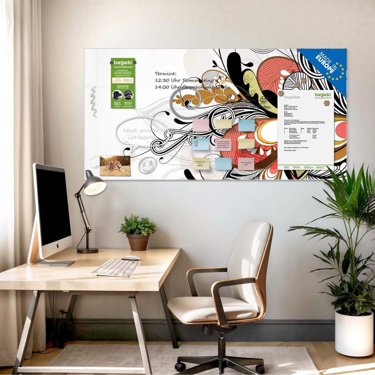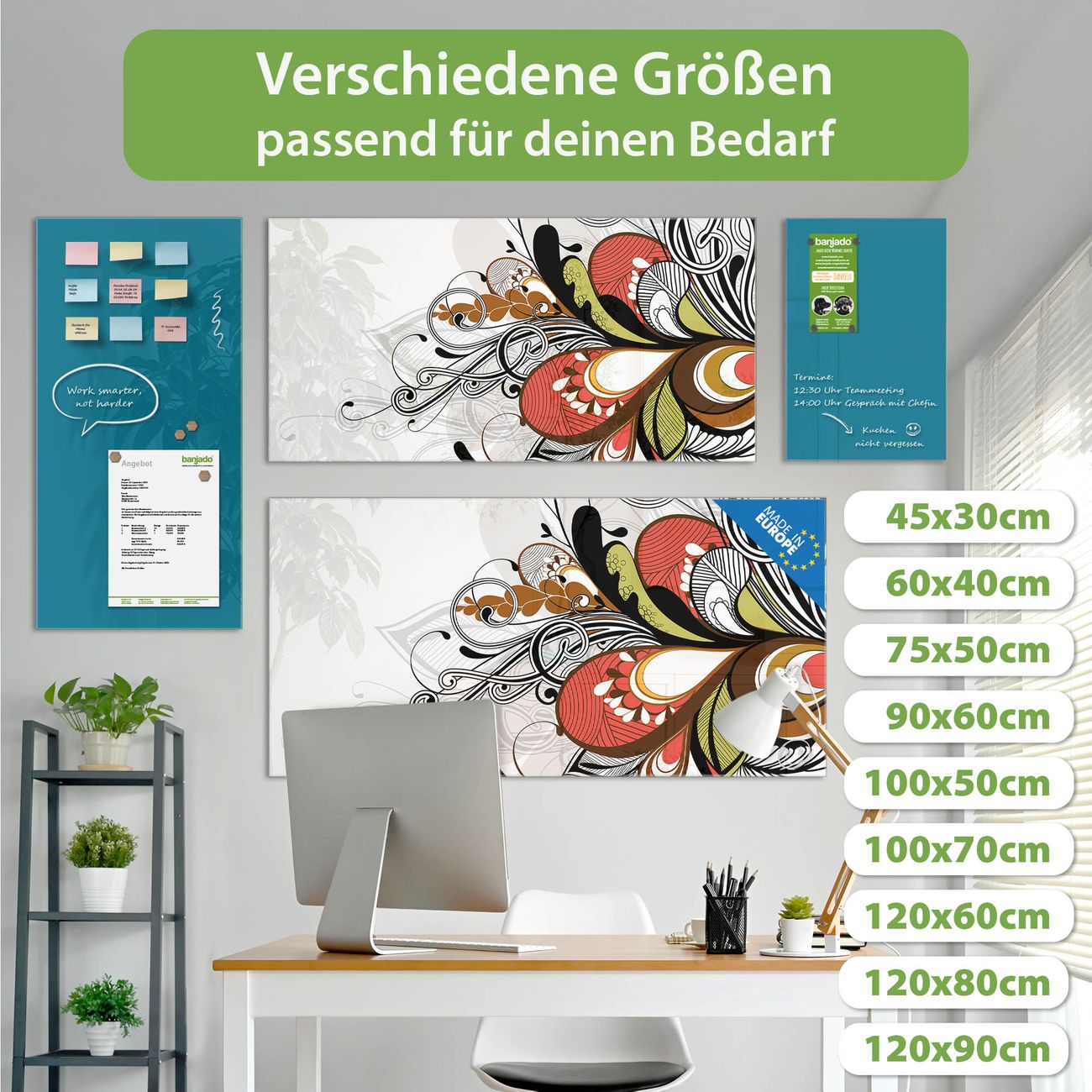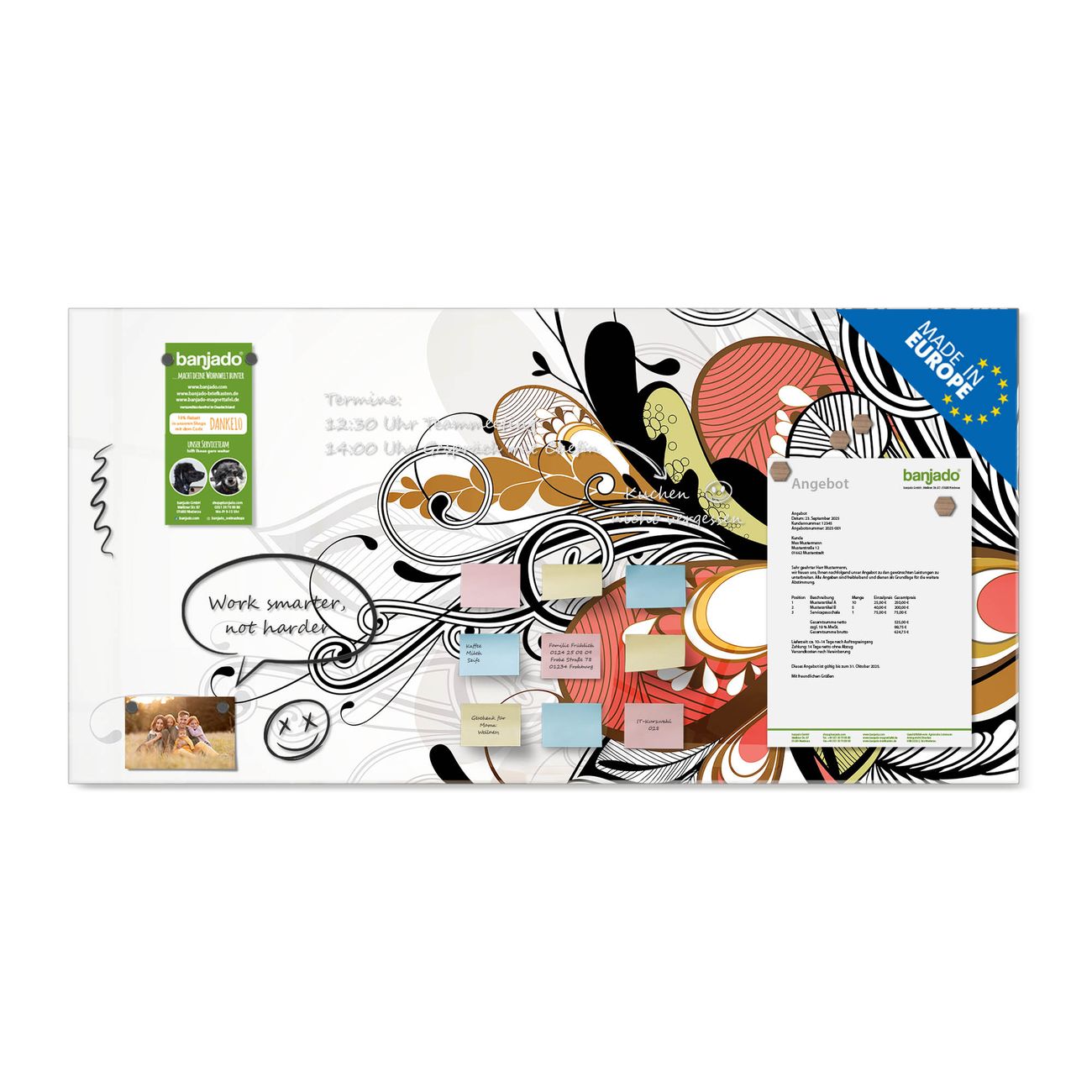 Jede Glas Magnettafel wird in unserer Werkstatt von Hand gefertigt und sorgfältig geprüft. So erhalten Sie ein echtes Qualitätsprodukt, das Funktion und Ästhetik perfekt vereint.?? Warum banjado?
