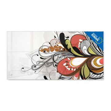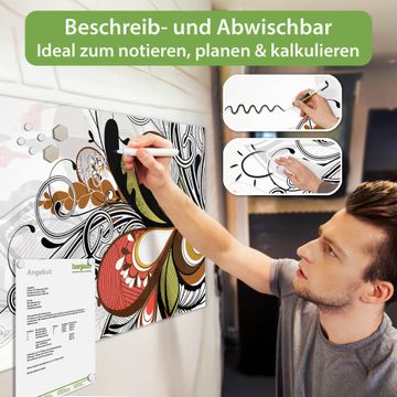 Material: 4mm Sicherheitsglas mit Metallrückwand Eigenschaften: beschreibbar, magnetisch, kratzfest Maße: 100x50x0,6cm, 7,50kg schwer Motiv Nummer 10373 Ornament 2 Zubehör: inklusive 4 Neodym-Magnete