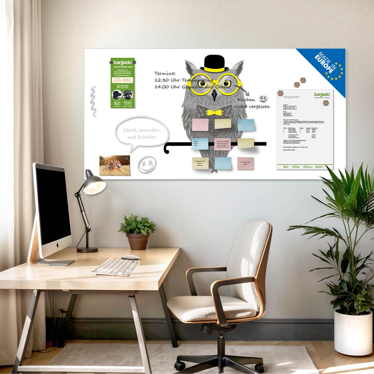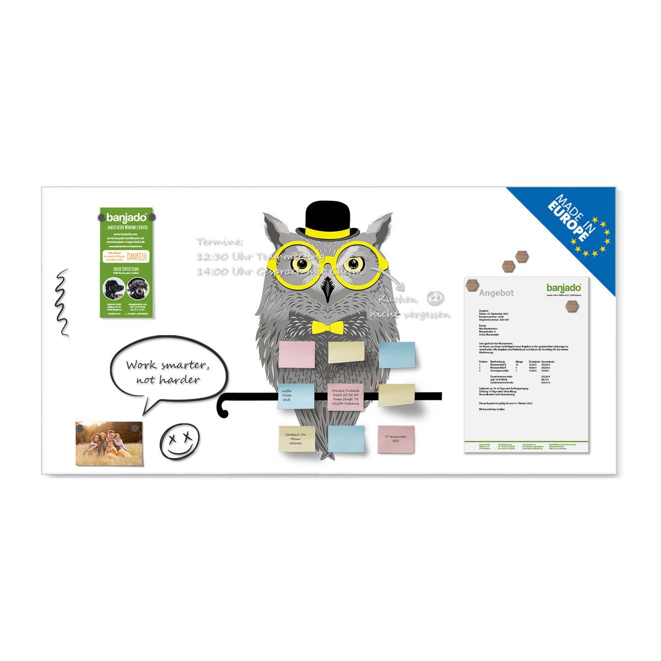 Jede Glas Magnettafel wird in unserer Werkstatt von Hand gefertigt und sorgfältig geprüft. So erhalten Sie ein echtes Qualitätsprodukt, das Funktion und Ästhetik perfekt vereint.?? Warum banjado?