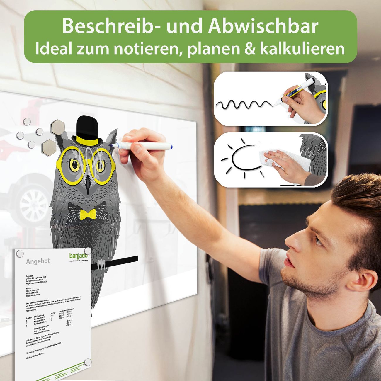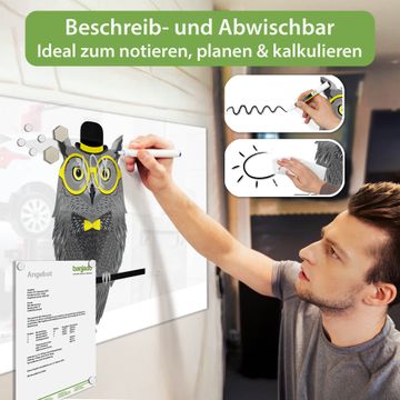 Material: 4mm Sicherheitsglas mit Metallrückwand Eigenschaften: beschreibbar, magnetisch, kratzfest Maße: 100x50x0,6cm, 7,50kg schwer Motiv Nummer 11153 Owling Zubehör: inklusive 4 Neodym-Magnete