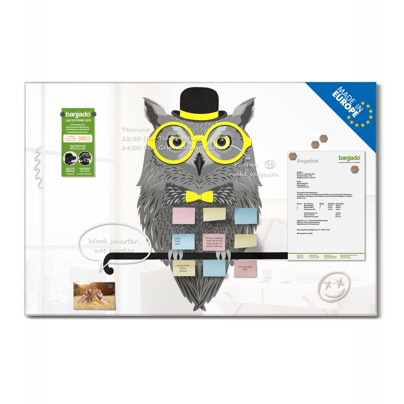 Jede Glas Magnettafel wird in unserer Werkstatt von Hand gefertigt und sorgfältig geprüft. So erhalten Sie ein echtes Qualitätsprodukt, das Funktion und Ästhetik perfekt vereint.?? Warum banjado?
