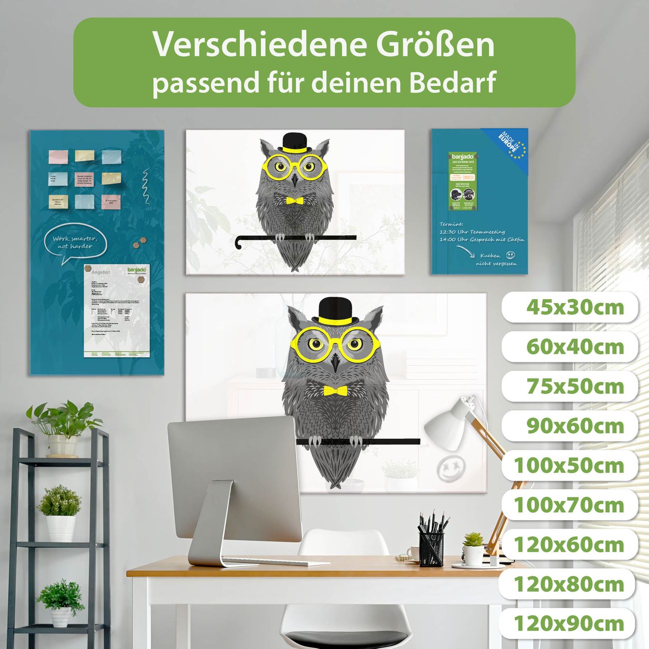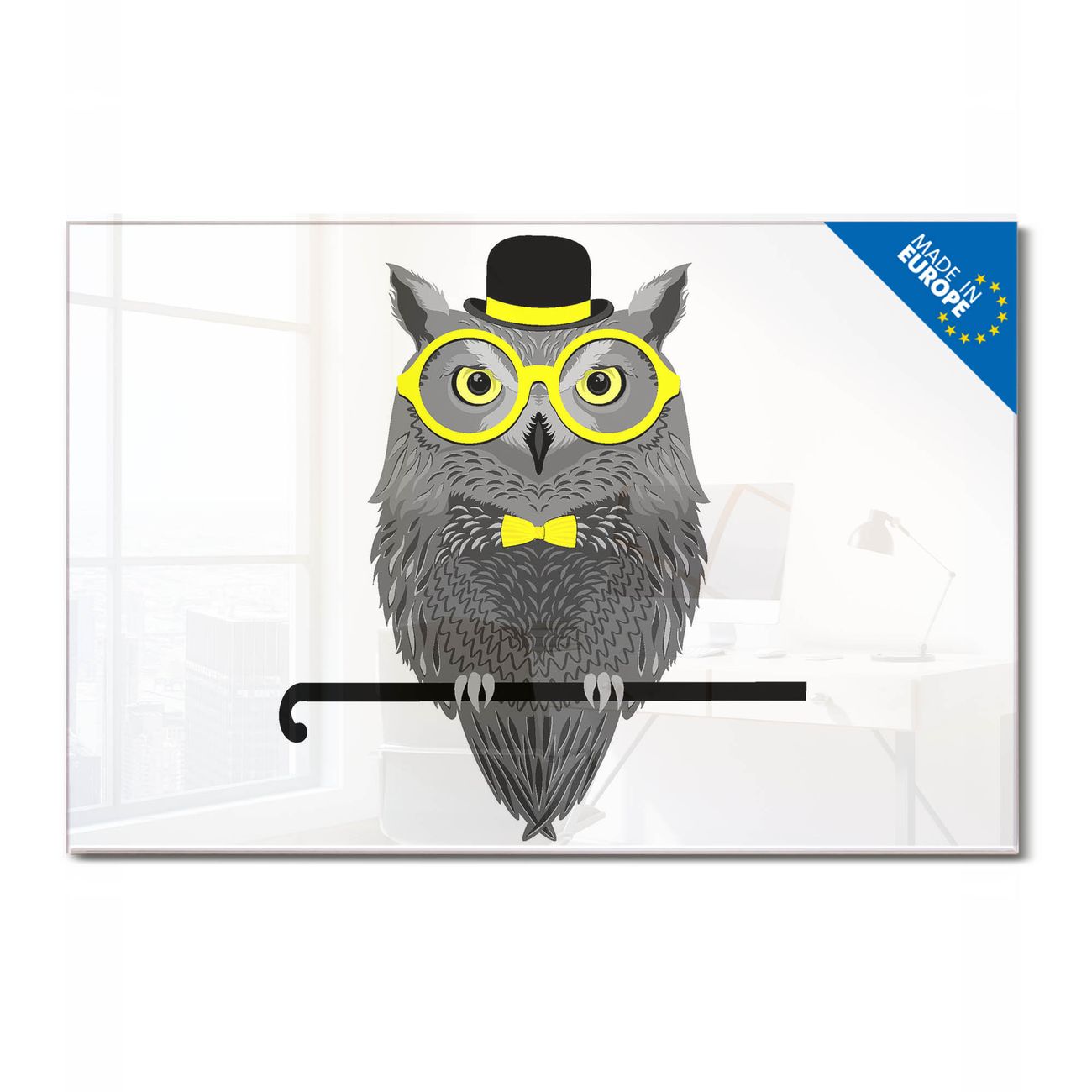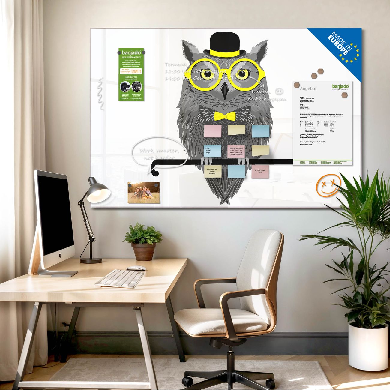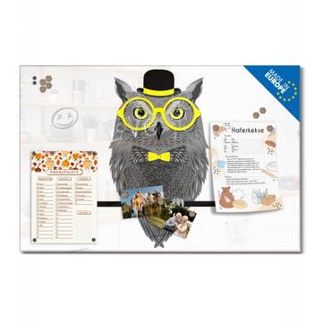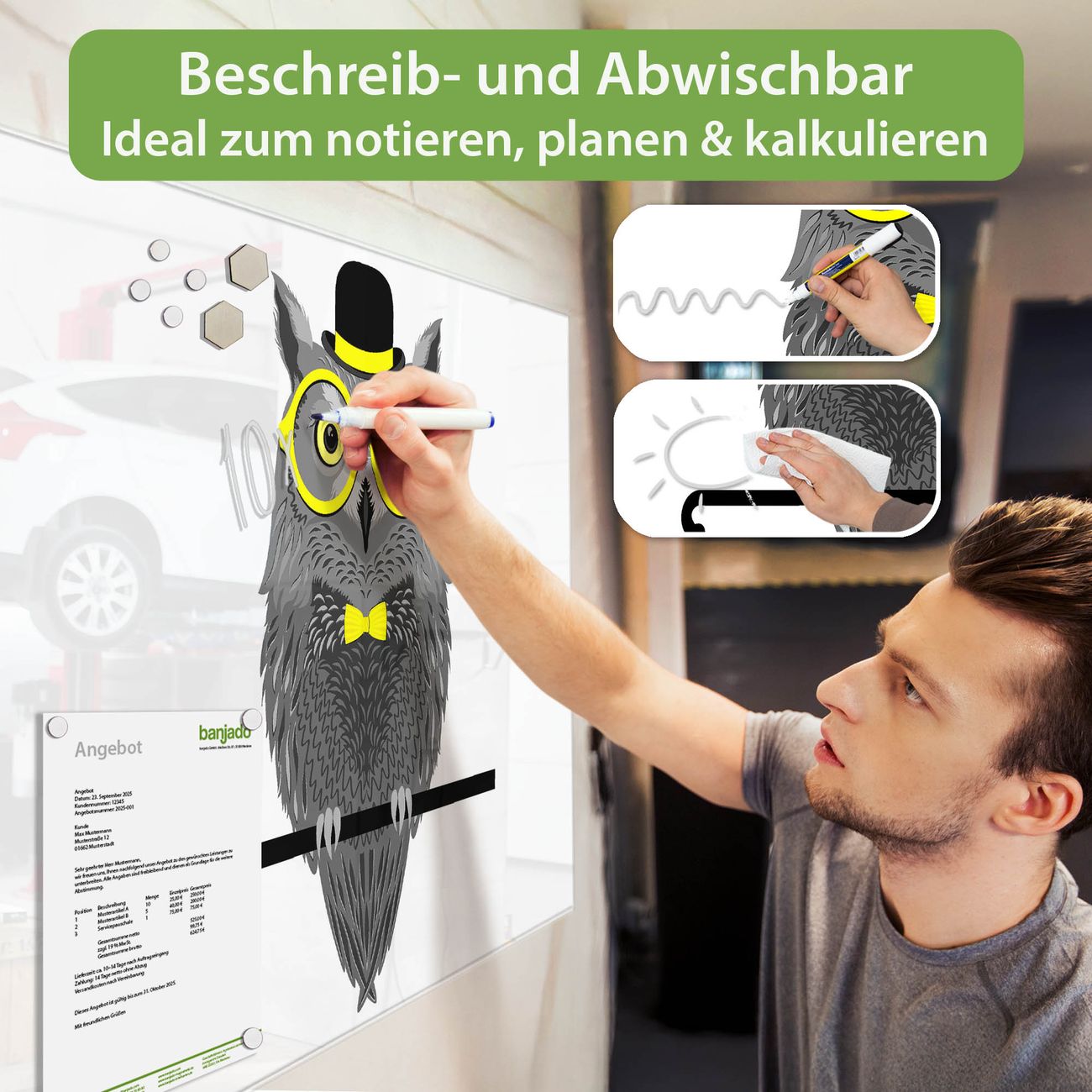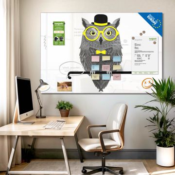 Material: 4mm Sicherheitsglas mit Metallrückwand Eigenschaften: beschreibbar, magnetisch, kratzfest Maße: 45x30x0,6cm, 2,03kg schwer Motiv Nummer 11153 Owling Zubehör: inklusive 4 Neodym-Magnete