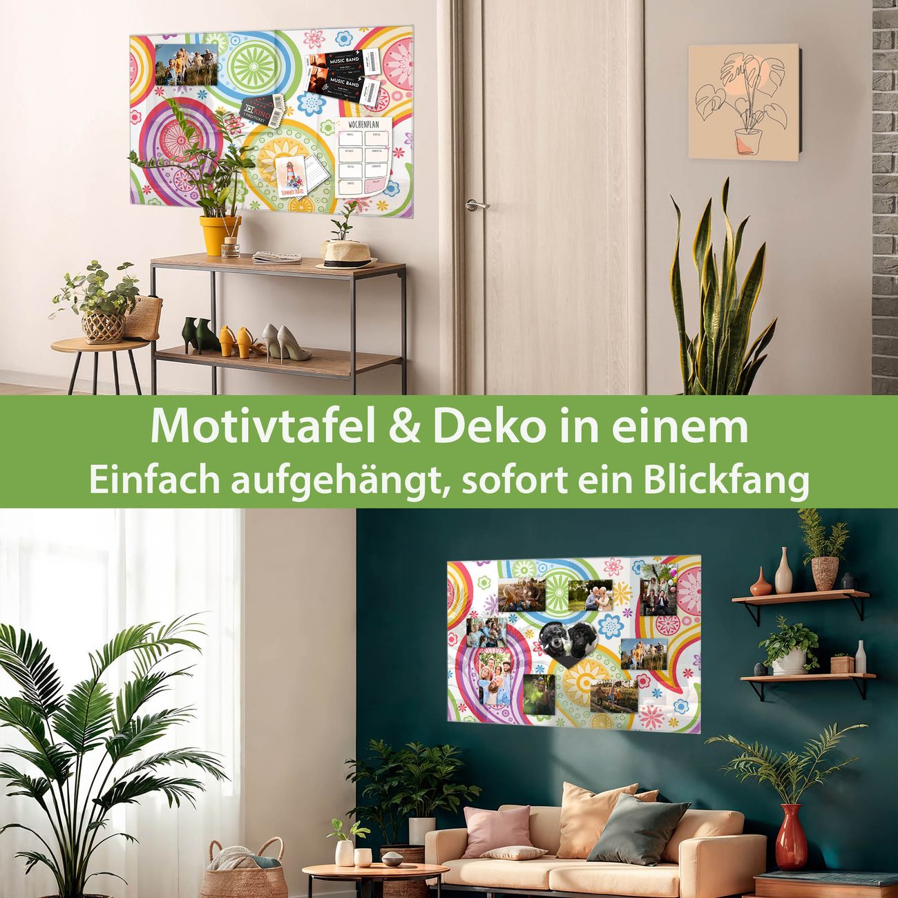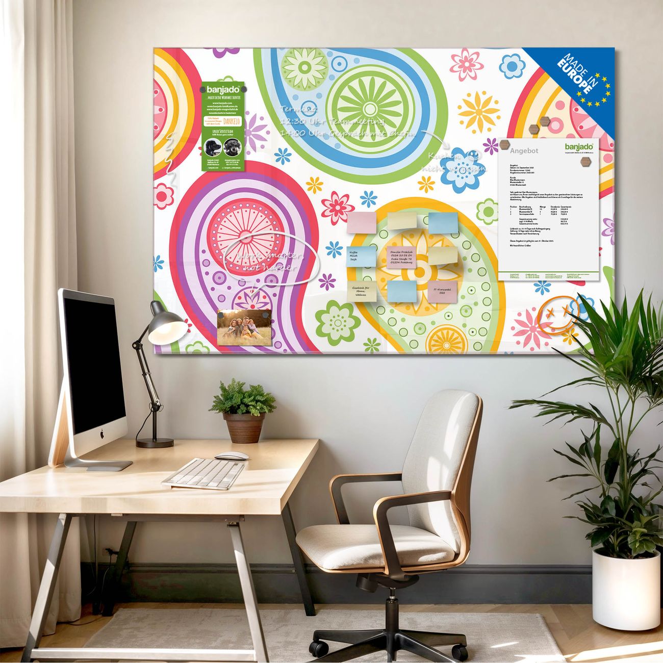 Material: 4mm Sicherheitsglas mit Metallrückwand Eigenschaften: beschreibbar, magnetisch, kratzfest Maße: 45x30x0,6cm, 2,03kg schwer Motiv Nummer 10066 Paisley bunt Zubehör: inklusive 4 Neodym-Magnete