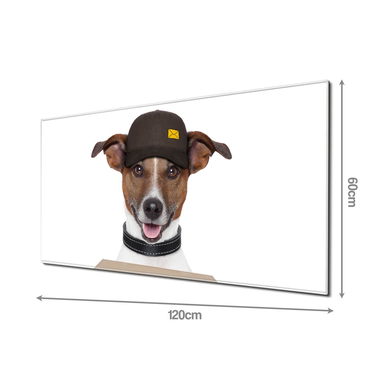 Material: 4mm Sicherheitsglas mit Metallrückwand Eigenschaften: beschreibbar, magnetisch, kratzfest Maße: 120x60x0,6cm, 10,80kg schwer Motiv Nummer 10477 Paketdienst Jack Russel Zubehör: inklusive 4 Neodym-Magnete