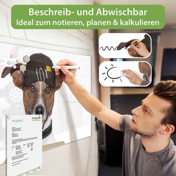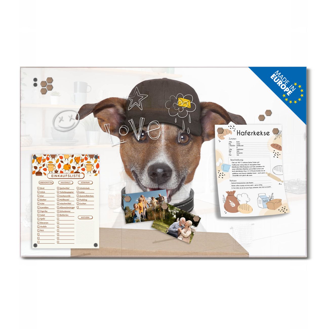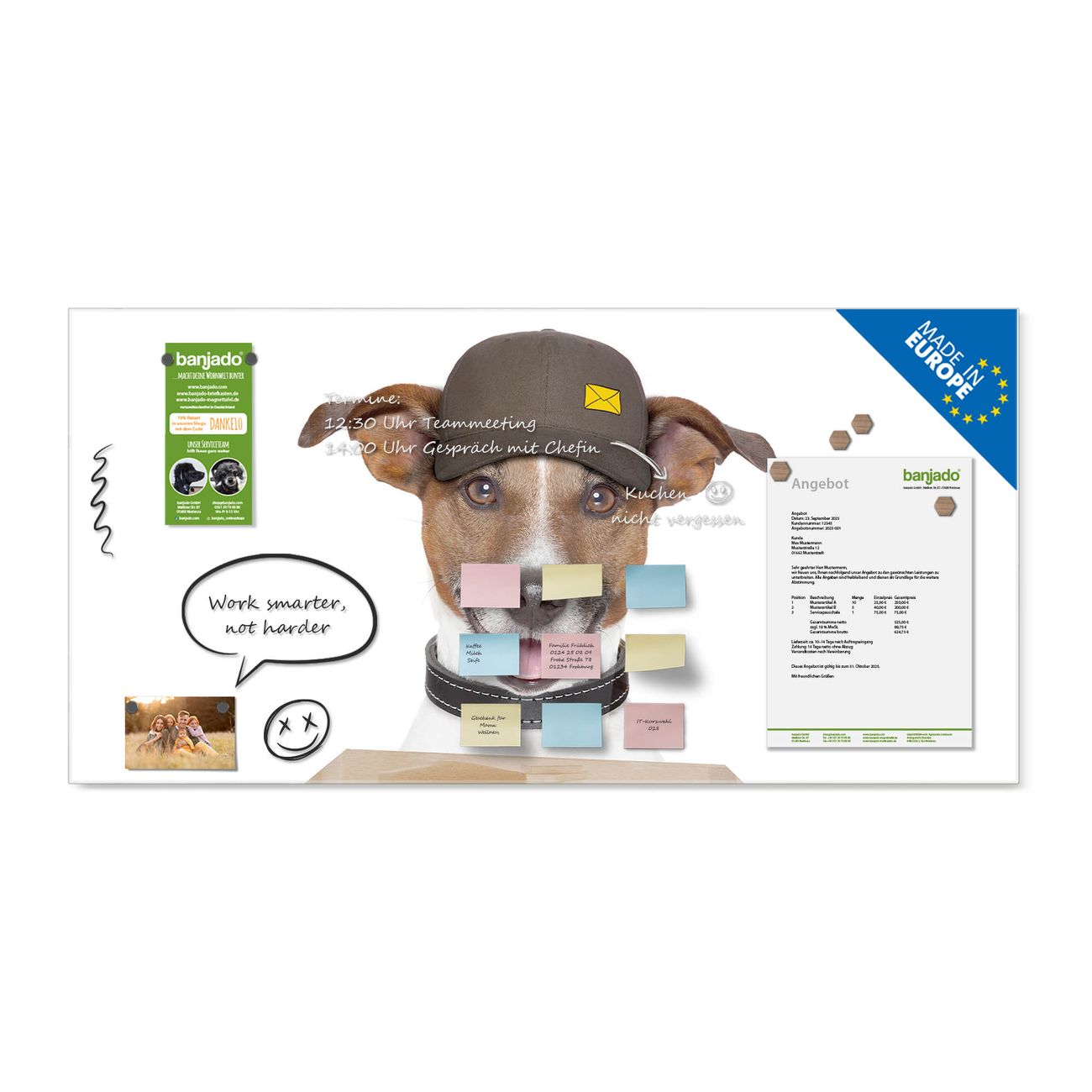 Material: 4mm Sicherheitsglas mit Metallrückwand Eigenschaften: beschreibbar, magnetisch, kratzfest Maße: 120x80x0,6cm, 14,40kg schwer Motiv Nummer 10477 Paketdienst Jack Russel Zubehör: inklusive 4 Neodym-Magnete