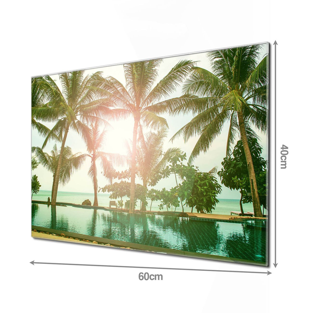 Material  4mm Sicherheitsglas mit Metallrückwand Eigenschaften  beschreibbar, magnetisch, kratzfest Maße  60x40x0,6cm, 3,6kg schwer Motiv  Nummer 12688 Palmen Zubehör  inklusive 4 Neodym-Magnete