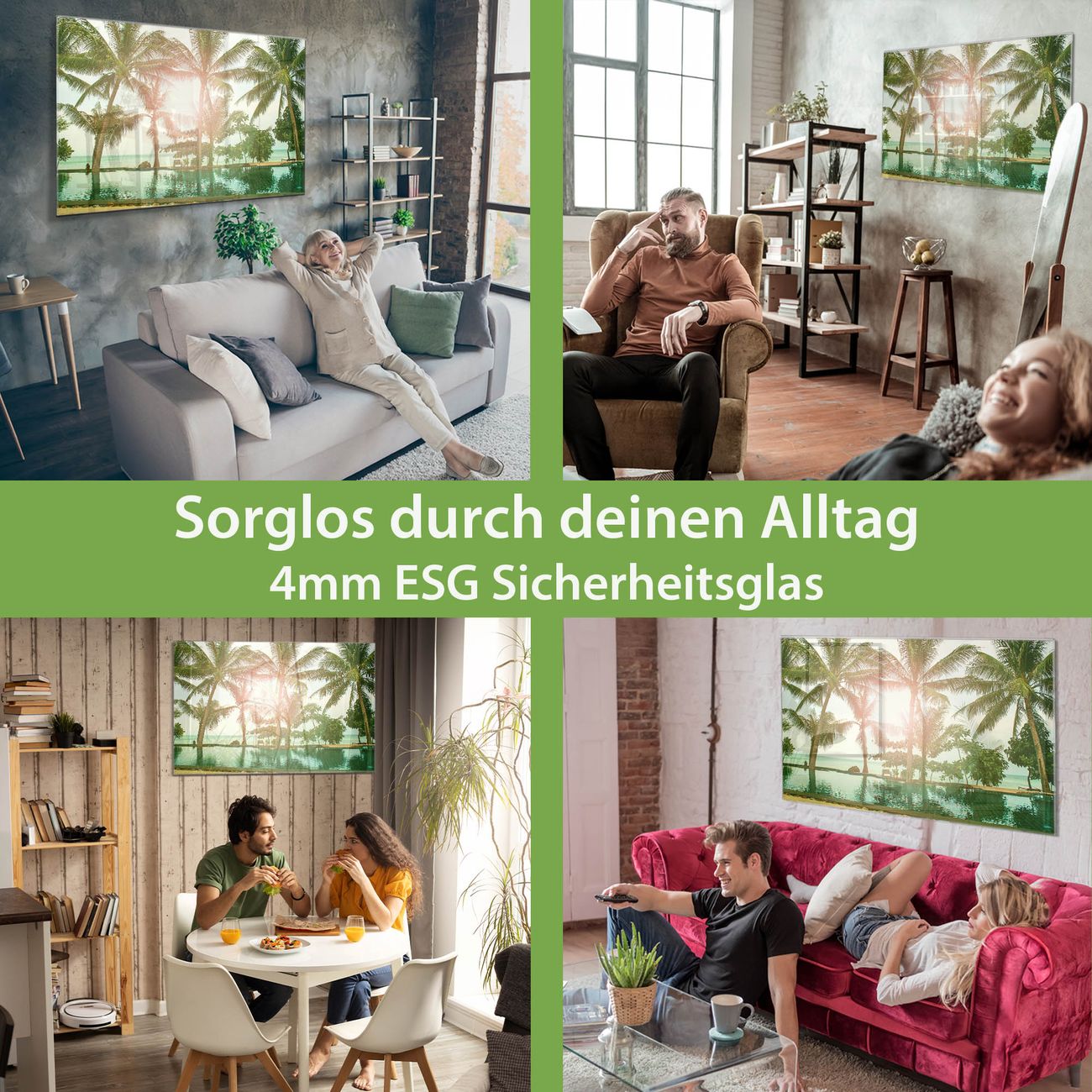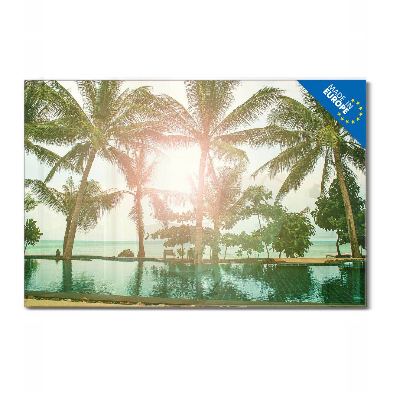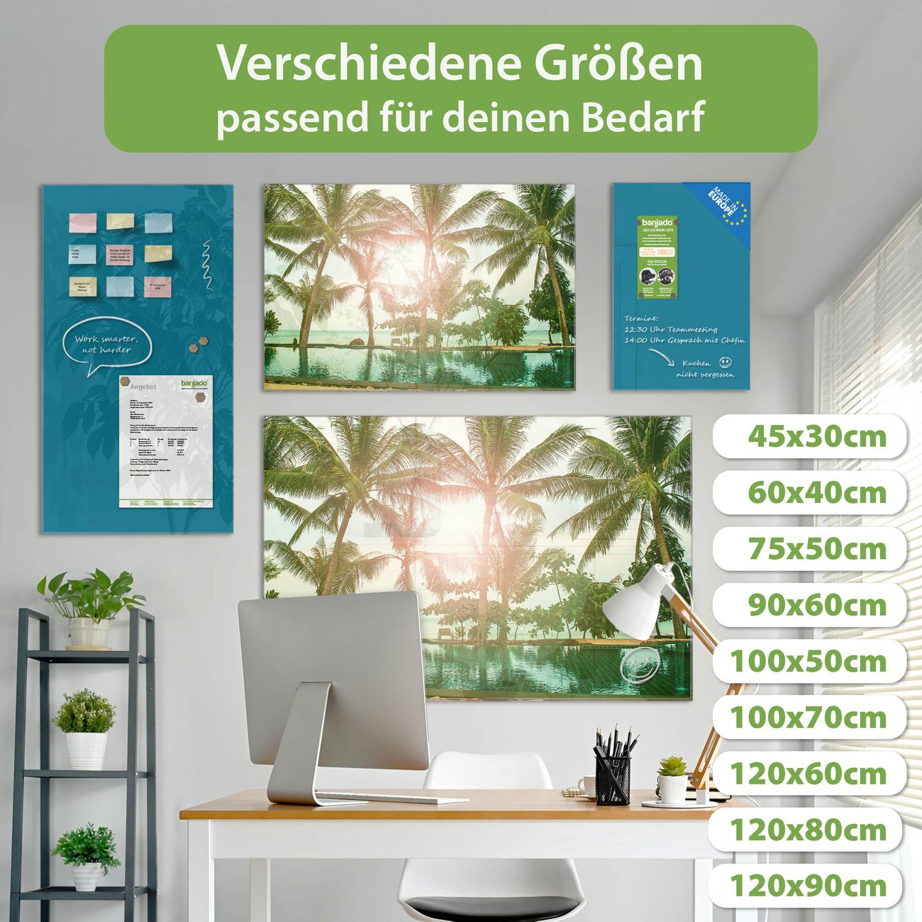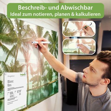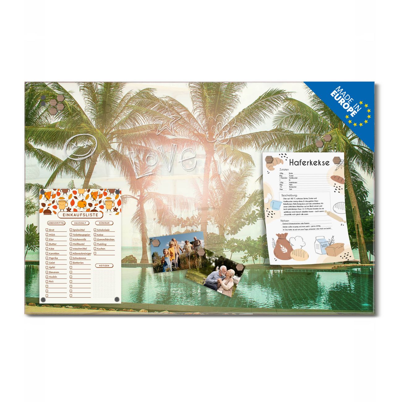 Material: 4mm Sicherheitsglas mit Metallrückwand Eigenschaften: beschreibbar, magnetisch, kratzfest Maße: 75x50x0,6cm, 5,63kg schwer Motiv Nummer 12688 Palmen Zubehör: inklusive 4 Neodym-Magnete