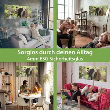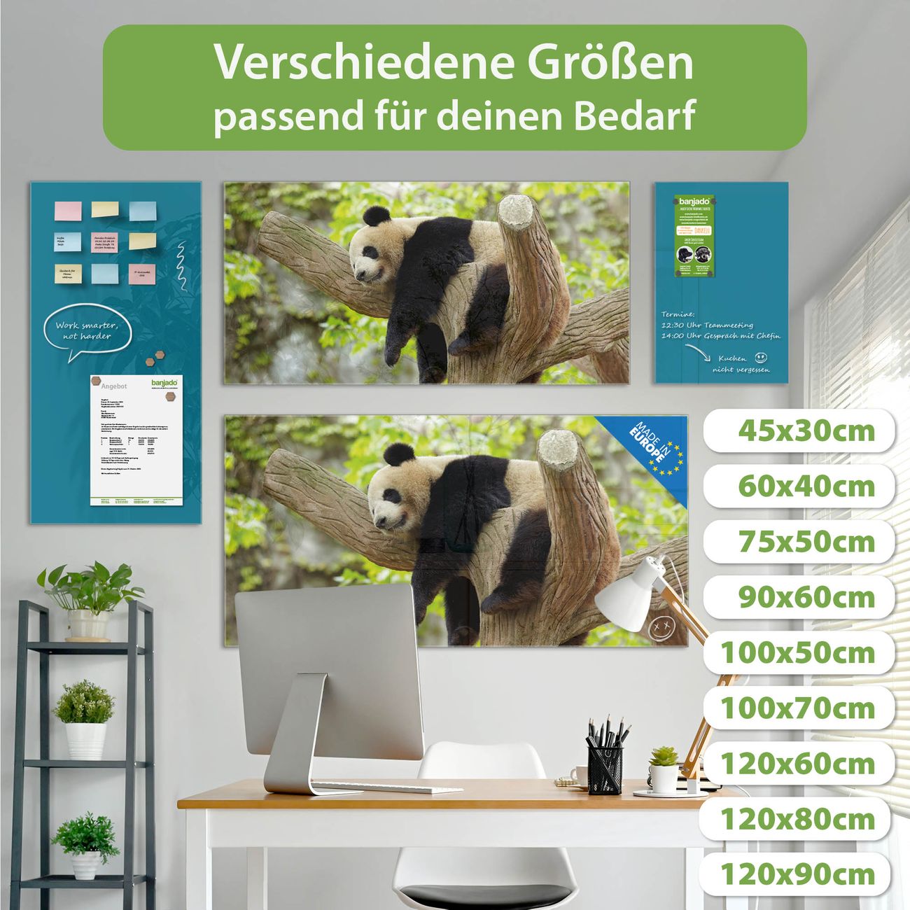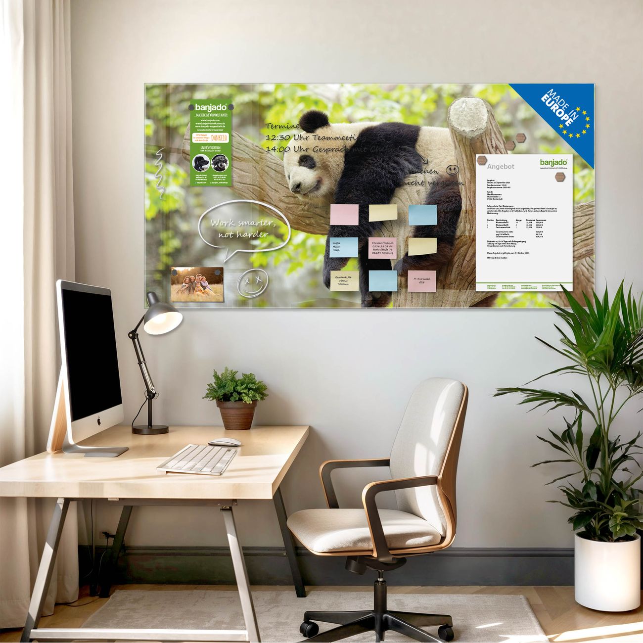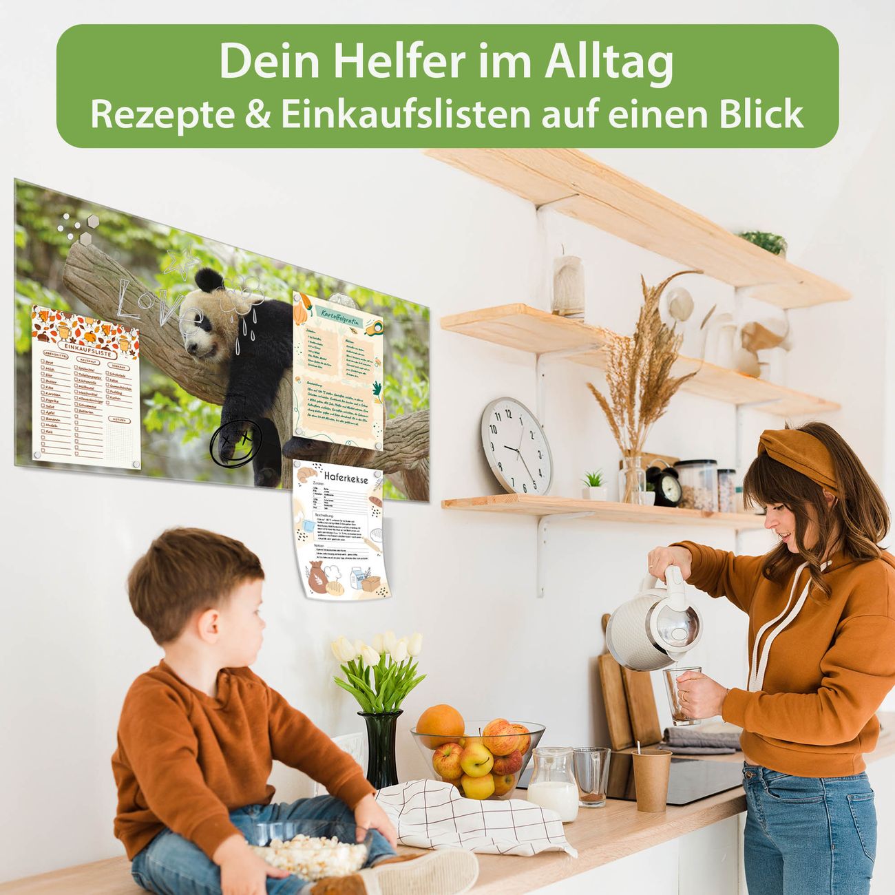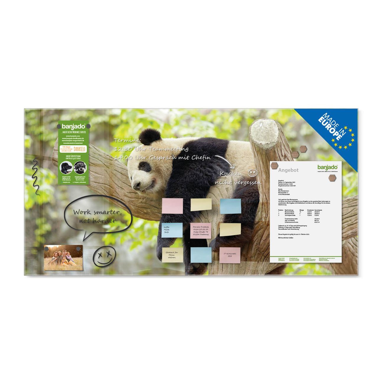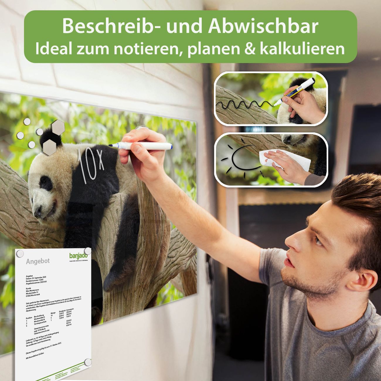 Material: 4mm Sicherheitsglas mit Metallrückwand Eigenschaften: beschreibbar, magnetisch, kratzfest Maße: 100x50x0,6cm, 7,50kg schwer Motiv Nummer 10493 Panda Zubehör: inklusive 4 Neodym-Magnete