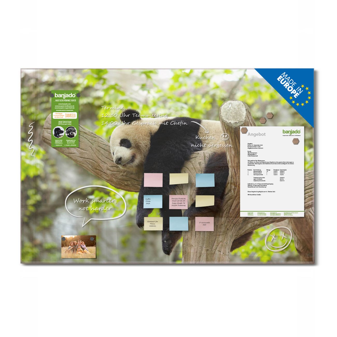 Jede Glas Magnettafel wird in unserer Werkstatt von Hand gefertigt und sorgfältig geprüft. So erhalten Sie ein echtes Qualitätsprodukt, das Funktion und Ästhetik perfekt vereint.?? Warum banjado?