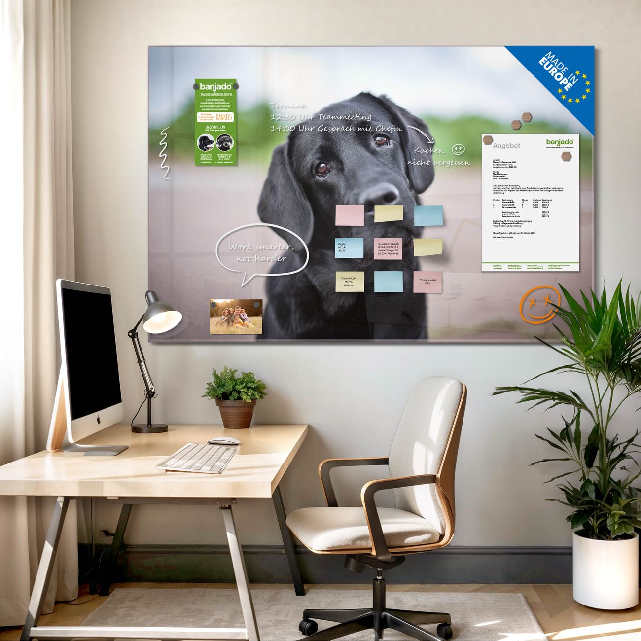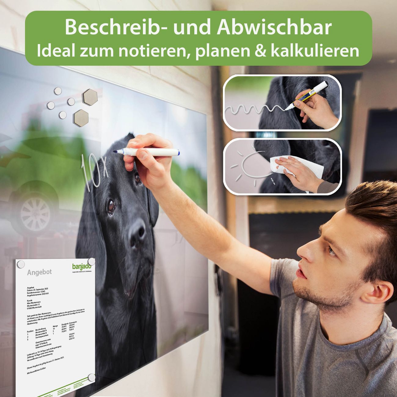 Jede Glas Magnettafel wird in unserer Werkstatt von Hand gefertigt und sorgfältig geprüft. So erhalten Sie ein echtes Qualitätsprodukt, das Funktion und Ästhetik perfekt vereint.?? Warum banjado?