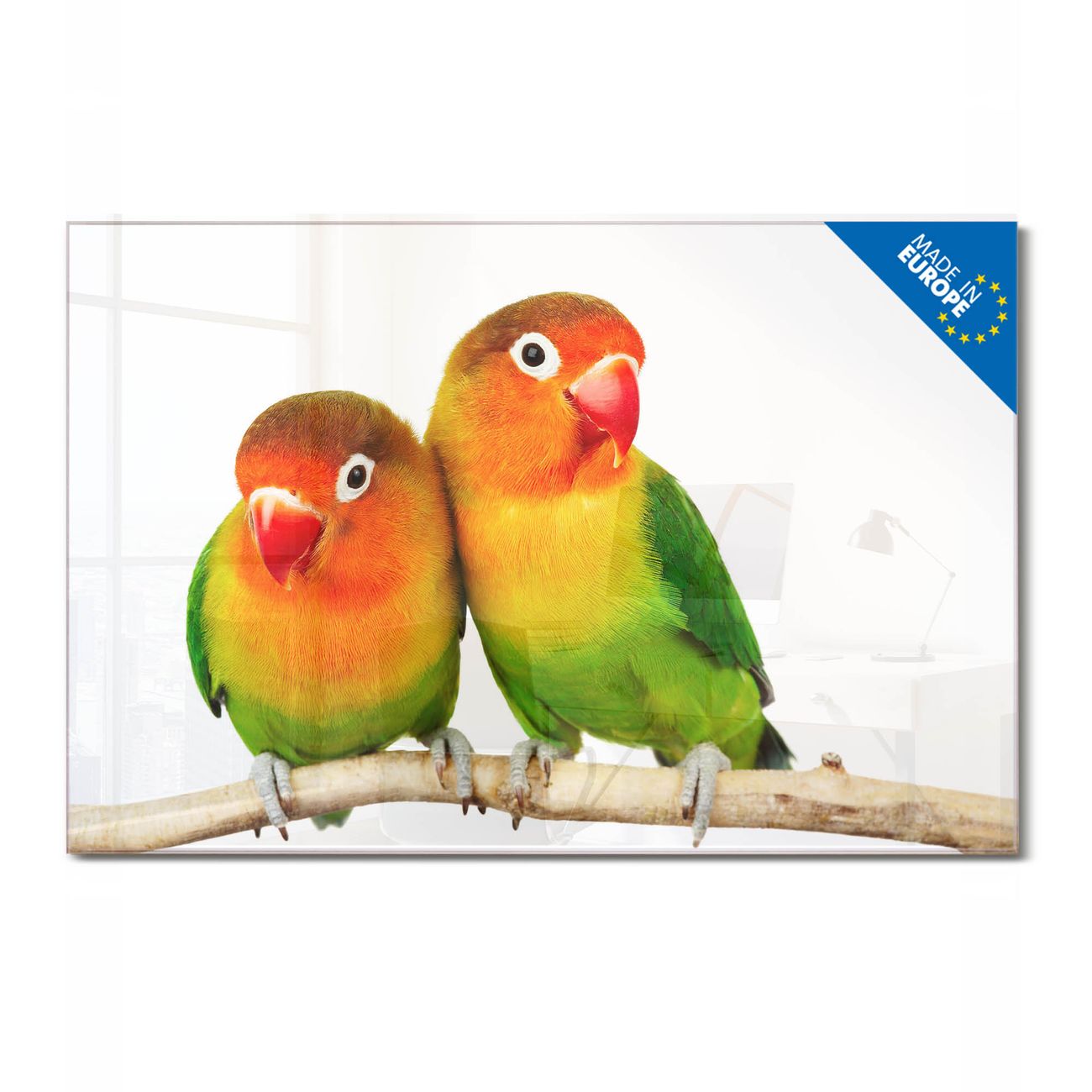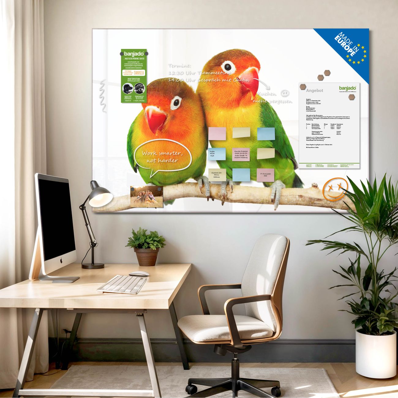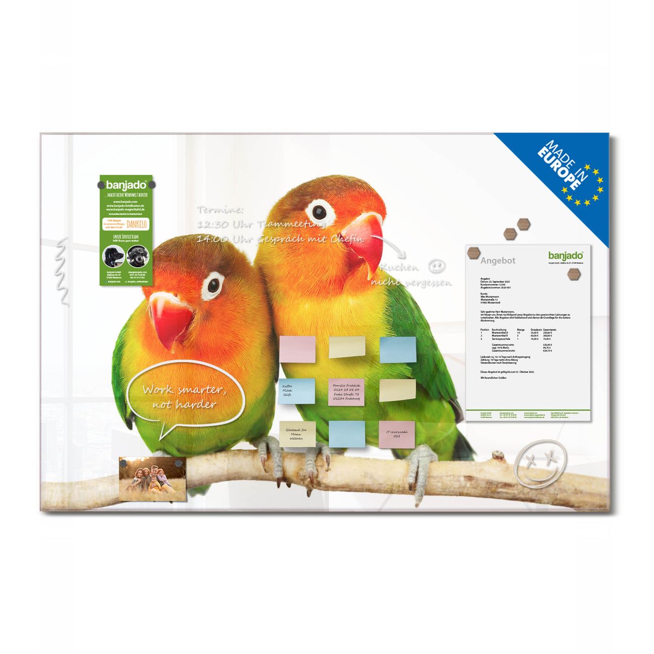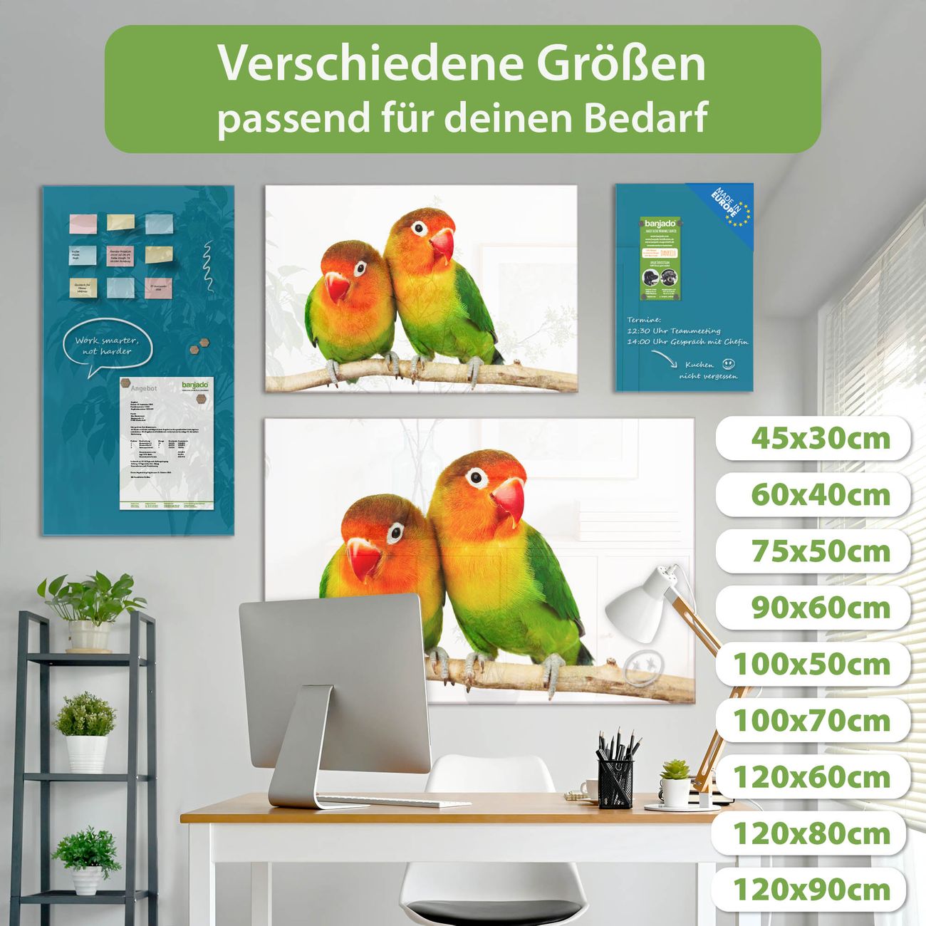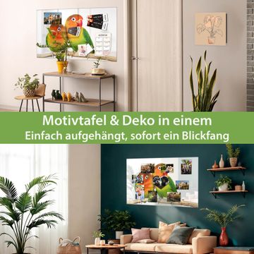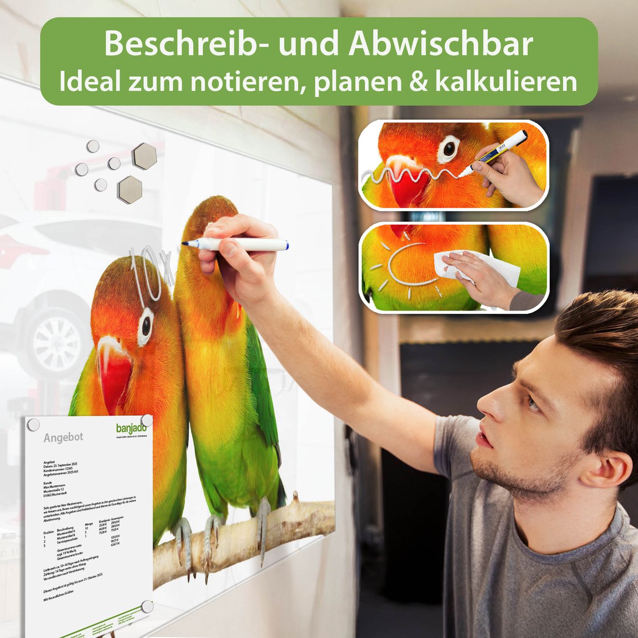 Material: 4mm Sicherheitsglas mit Metallrückwand Eigenschaften: beschreibbar, magnetisch, kratzfest Maße: 120x80x0,6cm, 14,40kg schwer Motiv Nummer 10148 Papageien Zubehör: inklusive 4 Neodym-Magnete