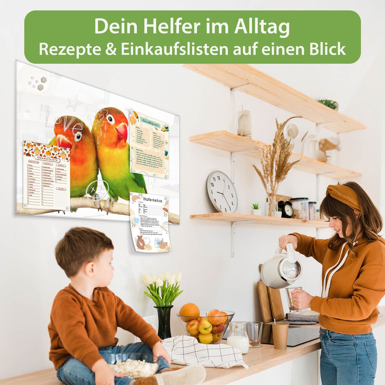 Ein Stück Design, das Ihren Alltag organisiert. Schreiben, heften, inspirieren - alles an einem Ort. Qualität, die man spürt. Montage leicht gemacht. Handwerk mit Herz - veredelt in Sachsen. Einzigartiges Design mit Motiv Motiv Papageien Beschreibbare Glasoberfläche, leicht zu reinigen Starke Magnetkraft durch Stahlrückwand Inklusive 4 Neodym-Magneten Flexible Montageoptionen Handveredelt in Sachsen - Qualität, die bleibt