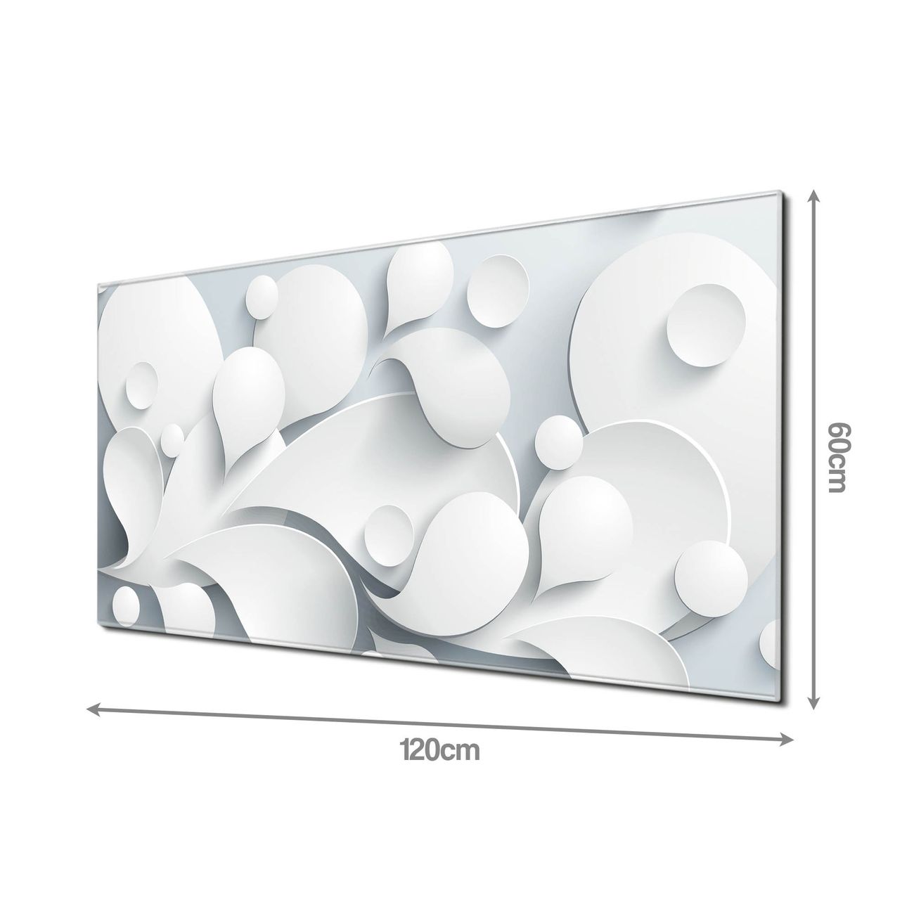 Material: 4mm Sicherheitsglas mit Metallrückwand Eigenschaften: beschreibbar, magnetisch, kratzfest Maße: 120x60x0,6cm, 10,80kg schwer Motiv Nummer 12452 Papiertropfen Zubehör: inklusive 4 Neodym-Magnete