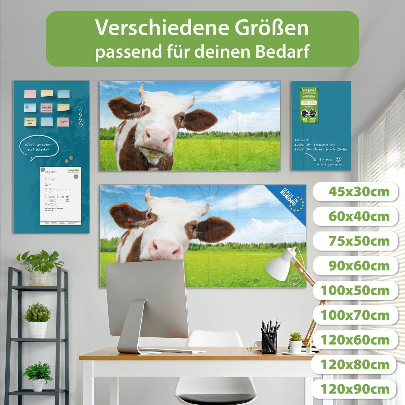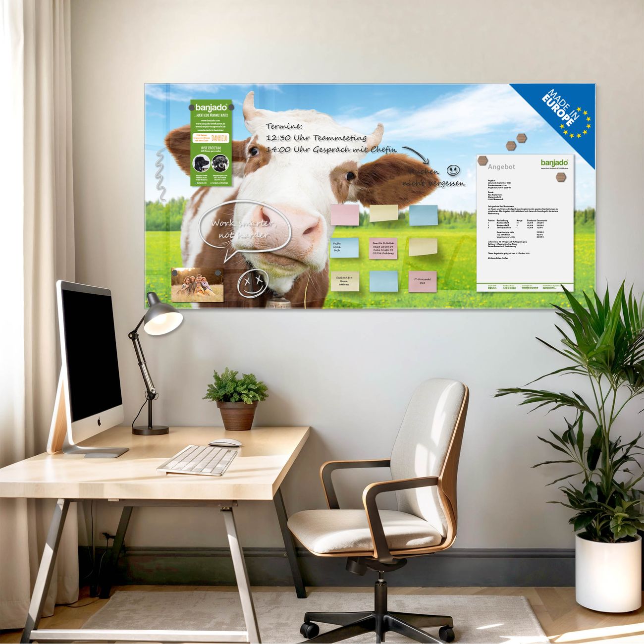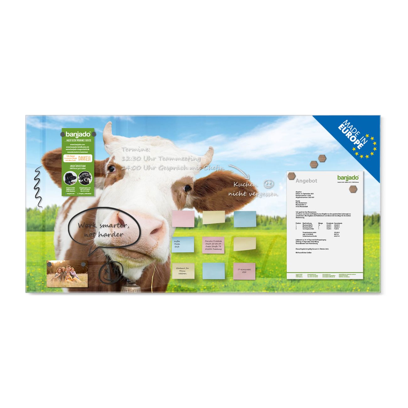 Jede Glas Magnettafel wird in unserer Werkstatt von Hand gefertigt und sorgfältig geprüft. So erhalten Sie ein echtes Qualitätsprodukt, das Funktion und Ästhetik perfekt vereint.?? Warum banjado?