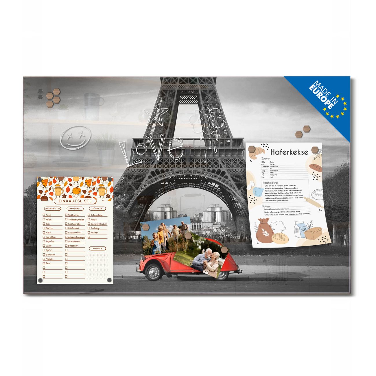 Material: 4mm Sicherheitsglas mit Metallrückwand Eigenschaften: beschreibbar, magnetisch, kratzfest Maße: 75x50x0,6cm, 5,63kg schwer Motiv Nummer 10062 Paris Zubehör: inklusive 4 Neodym-Magnete