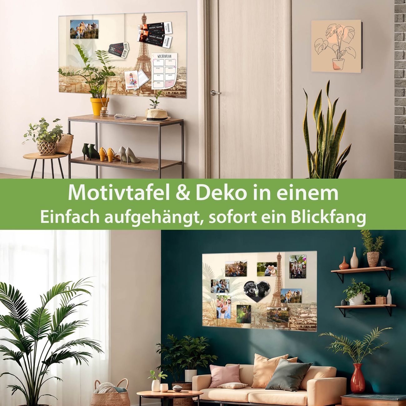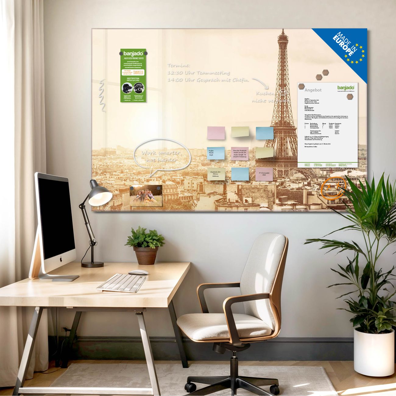 Die banjado Glas Magnettafel mit dem Motiv Motiv Dächer Von Paris verbindet Funktionalität mit Stil. Sie ersetzt das Zettelchaos durch klare Strukturen und bringt dabei eine warme, natürliche Atmosphäre in Ihr Zuhause. Ob im Büro, in der Küche oder im Eingangsbereich - dieses Design-Board zieht Blicke an und sorgt für Ordnung mit Charakter.