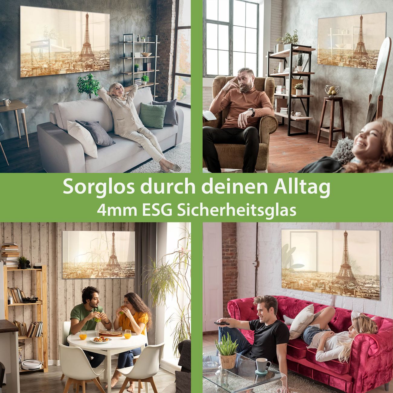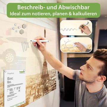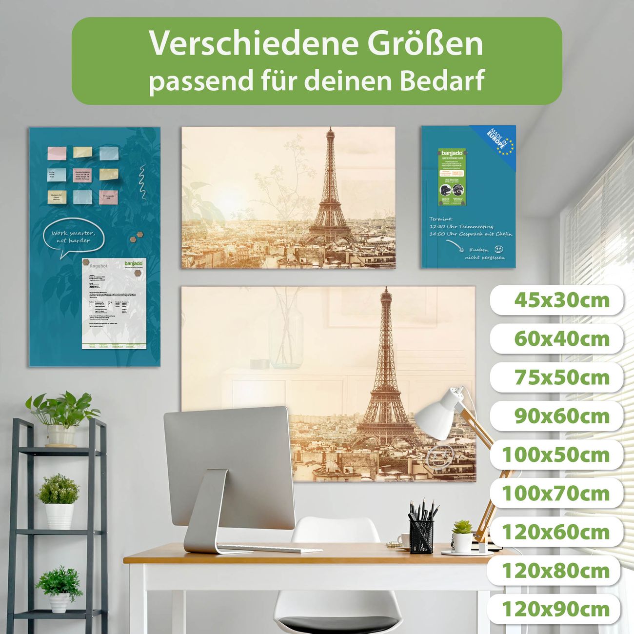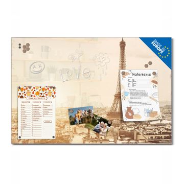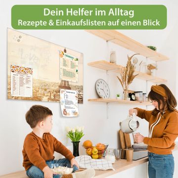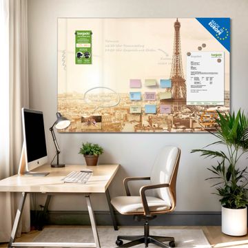 Material: 4mm Sicherheitsglas mit Metallrückwand Eigenschaften: beschreibbar, magnetisch, kratzfest Maße: 75x50x0,6cm, 5,63kg schwer Motiv Nummer 11406 Dächer Von Paris Zubehör: inklusive 4 Neodym-Magnete