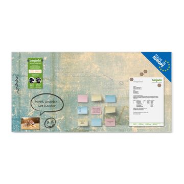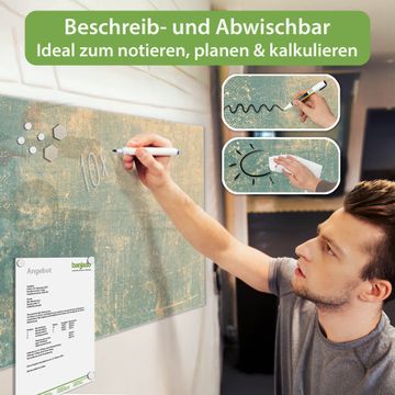 Material: 4mm Sicherheitsglas mit Metallrückwand Eigenschaften: beschreibbar, magnetisch, kratzfest Maße: 100x50x0,6cm, 7,50kg schwer Motiv Nummer 11484 Patina Grün Zubehör: inklusive 4 Neodym-Magnete