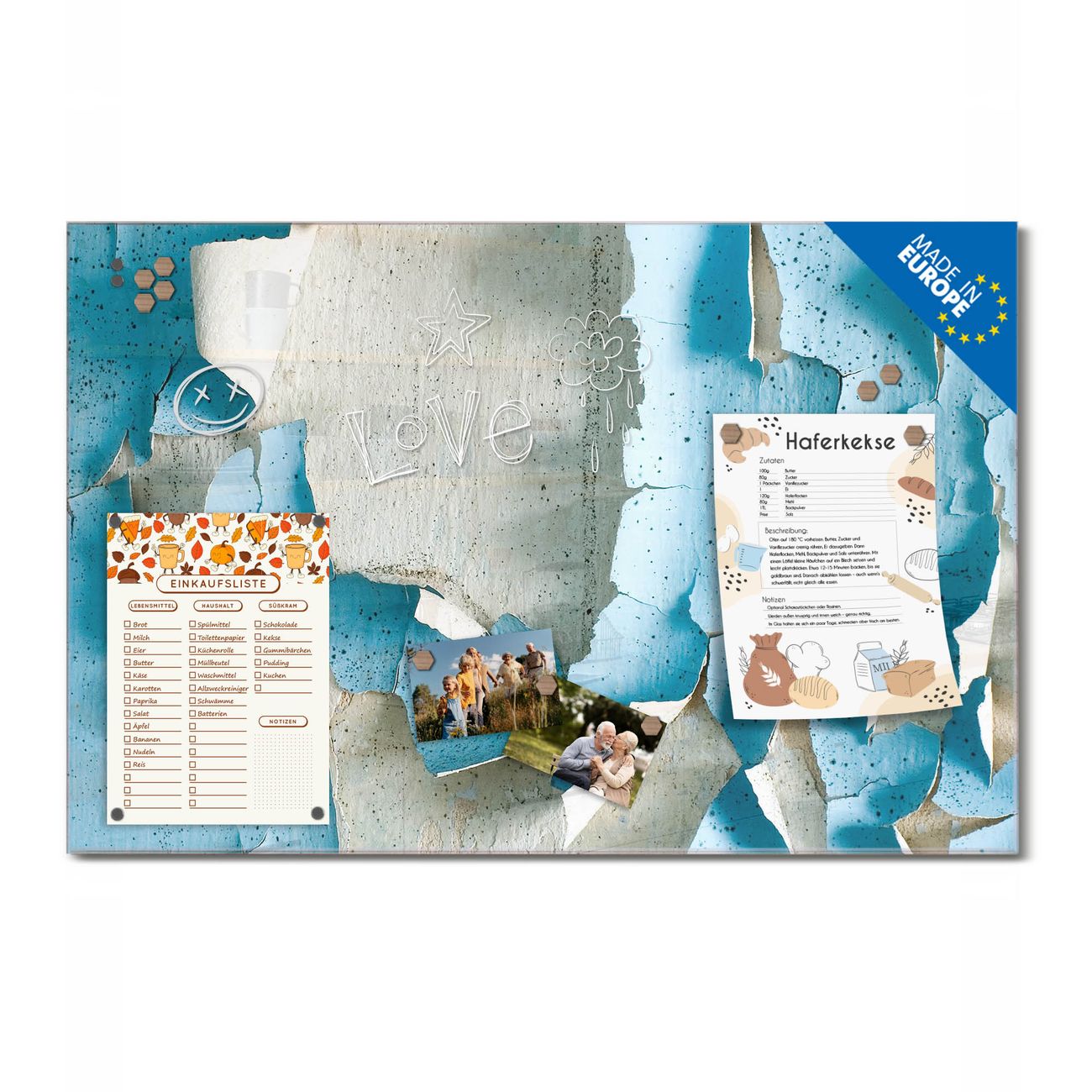 Auf der glatten Glasoberfläche lassen sich Termine, Rezepte oder Notizen ganz einfach mit Kreidestiften festhalten und rückstandslos entfernen. Starke Neodym-Magnete halten Ihre wichtigsten Erinnerungen sicher an Ort und Stelle. So entsteht Ihre ganz persönliche Ideenwand - jeden Tag neu.