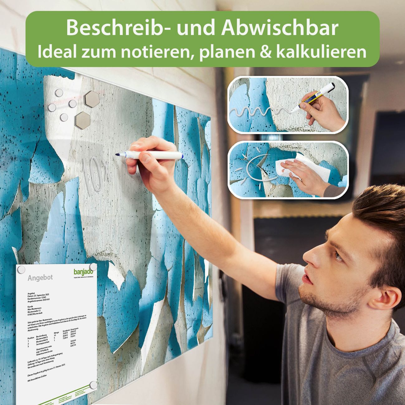 Bitte beachten Sie, dass ausschliessliche spezielle Magnete an der Glastafel haften. Wir empfehlen banjado Neodym Magnete, diese sind durch uns auf Wirksamkeit geprüft.