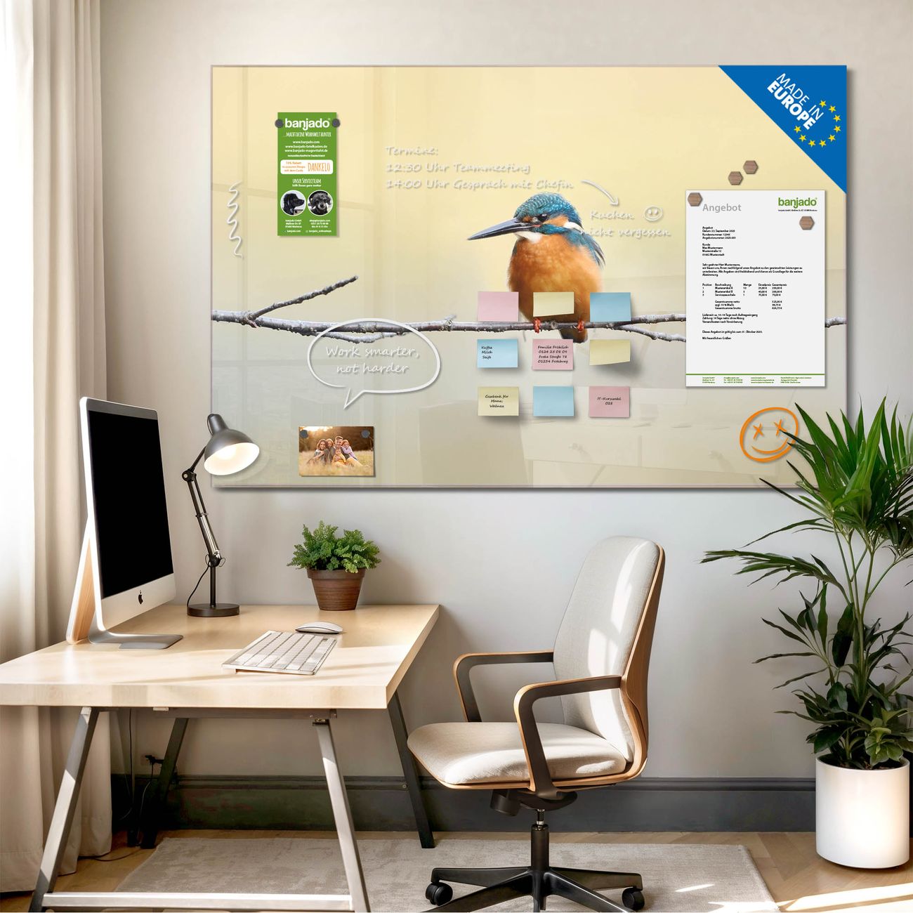 Jede Glas Magnettafel wird in unserer Werkstatt von Hand gefertigt und sorgfältig geprüft. So erhalten Sie ein echtes Qualitätsprodukt, das Funktion und Ästhetik perfekt vereint.?? Warum banjado?