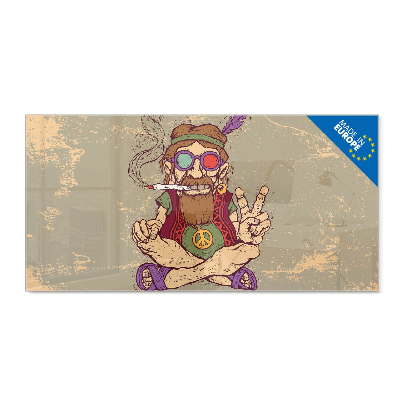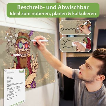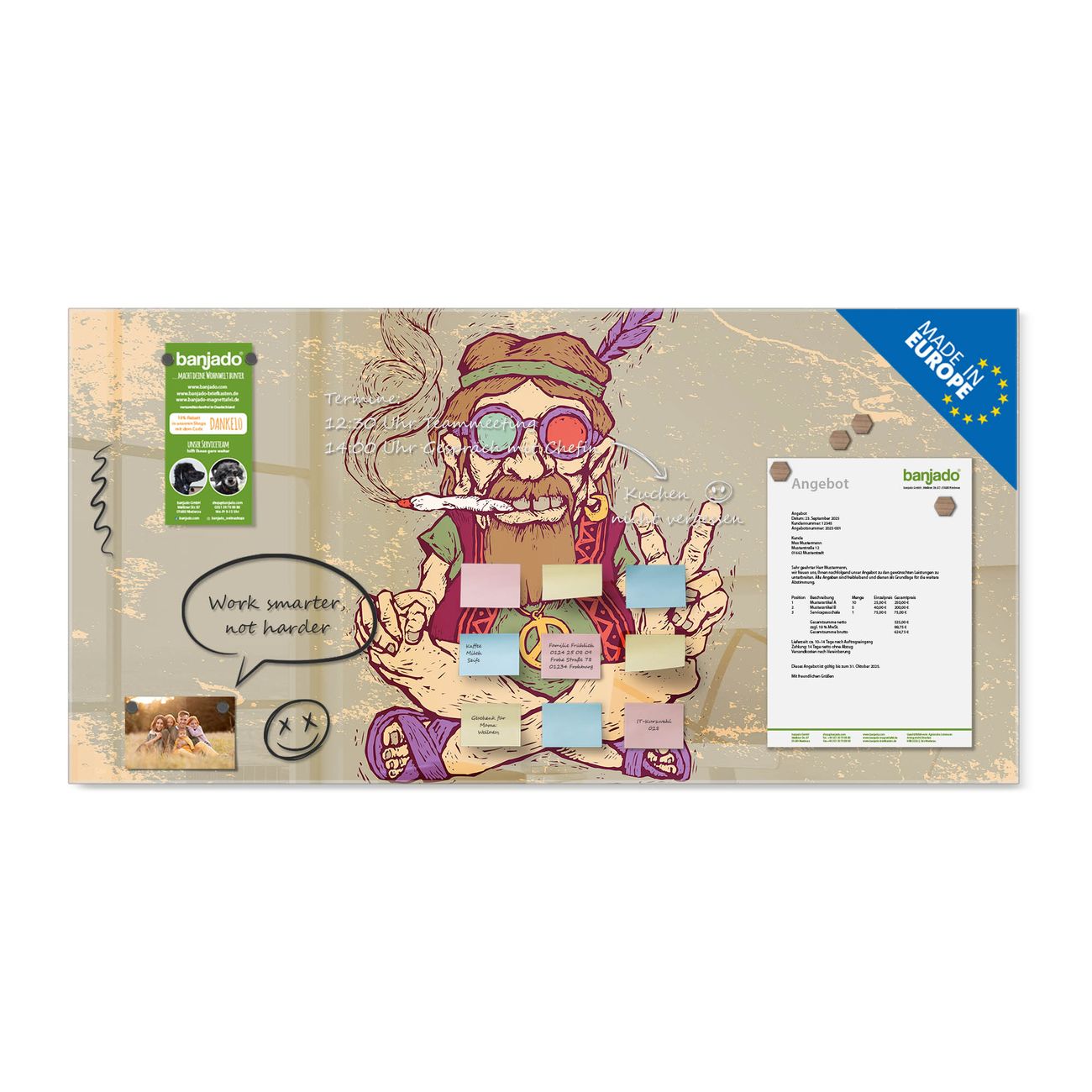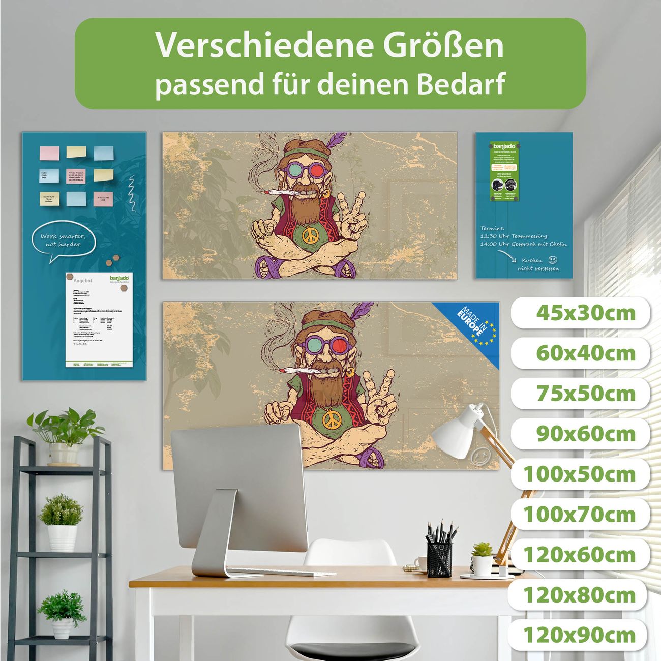 Material: 4mm Sicherheitsglas mit Metallrückwand Eigenschaften: beschreibbar, magnetisch, kratzfest Maße: 100x50x0,6cm, 7,50kg schwer Motiv Nummer 12068 Peace Zubehör: inklusive 4 Neodym-Magnete