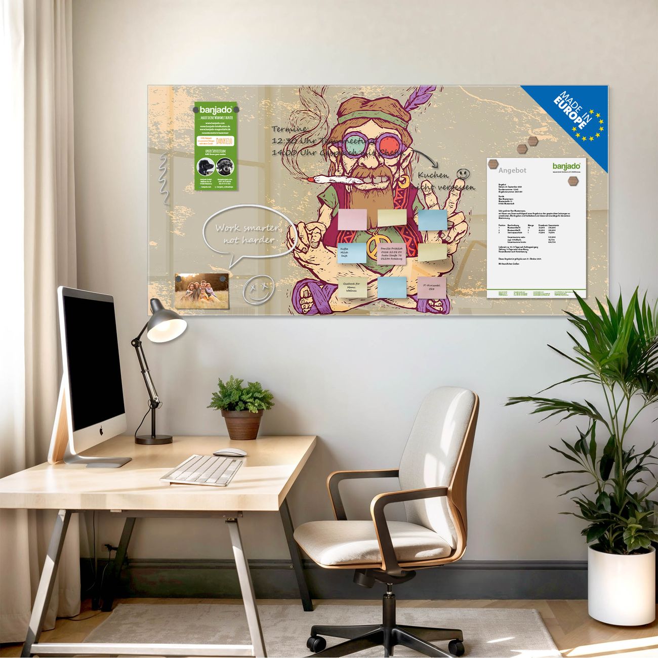 Die banjado Glas Magnettafel mit dem Motiv Motiv Peace verbindet Funktionalität mit Stil. Sie ersetzt das Zettelchaos durch klare Strukturen und bringt dabei eine warme, natürliche Atmosphäre in Ihr Zuhause. Ob im Büro, in der Küche oder im Eingangsbereich - dieses Design-Board zieht Blicke an und sorgt für Ordnung mit Charakter.