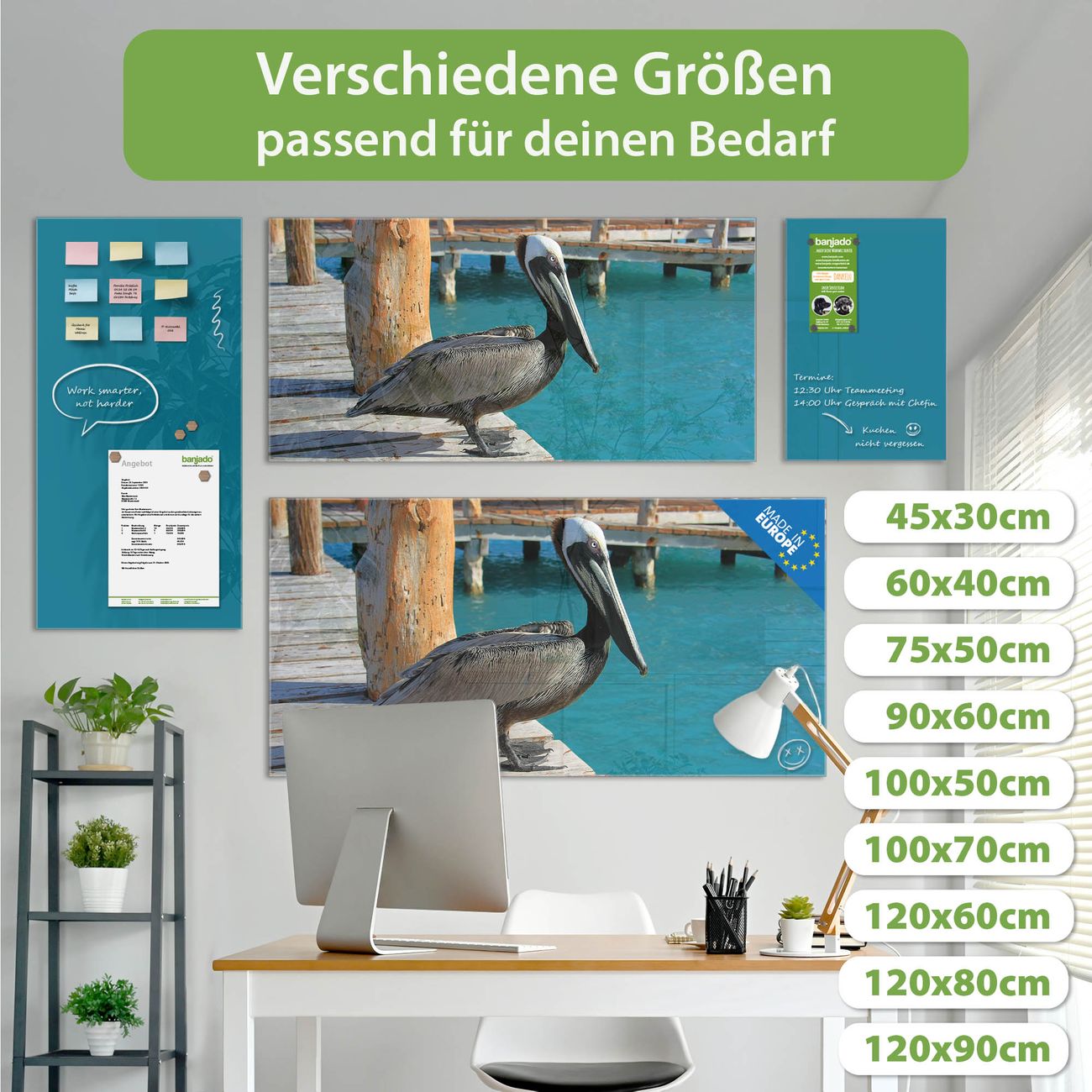 Material: 4mm Sicherheitsglas mit Metallrückwand Eigenschaften: beschreibbar, magnetisch, kratzfest Maße: 120x60x0,6cm, 10,80kg schwer Motiv Nummer 12251 Pelikan Zubehör: inklusive 4 Neodym-Magnete