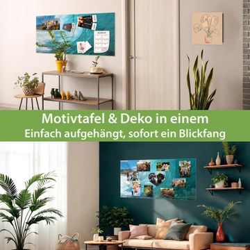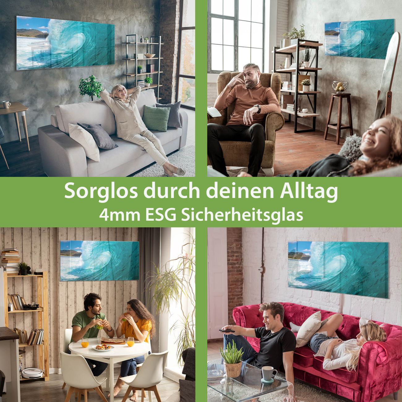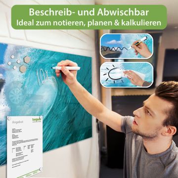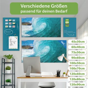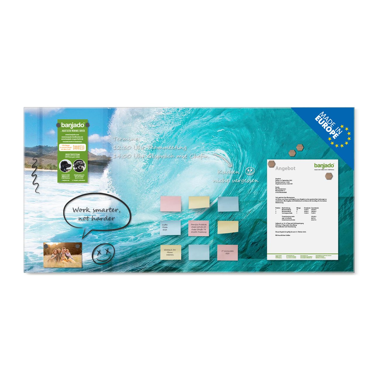 Material: 4mm Sicherheitsglas mit Metallrückwand Eigenschaften: beschreibbar, magnetisch, kratzfest Maße: 100x50x0,6cm, 7,50kg schwer Motiv Nummer 10096 Perfekte Welle Zubehör: inklusive 4 Neodym-Magnete