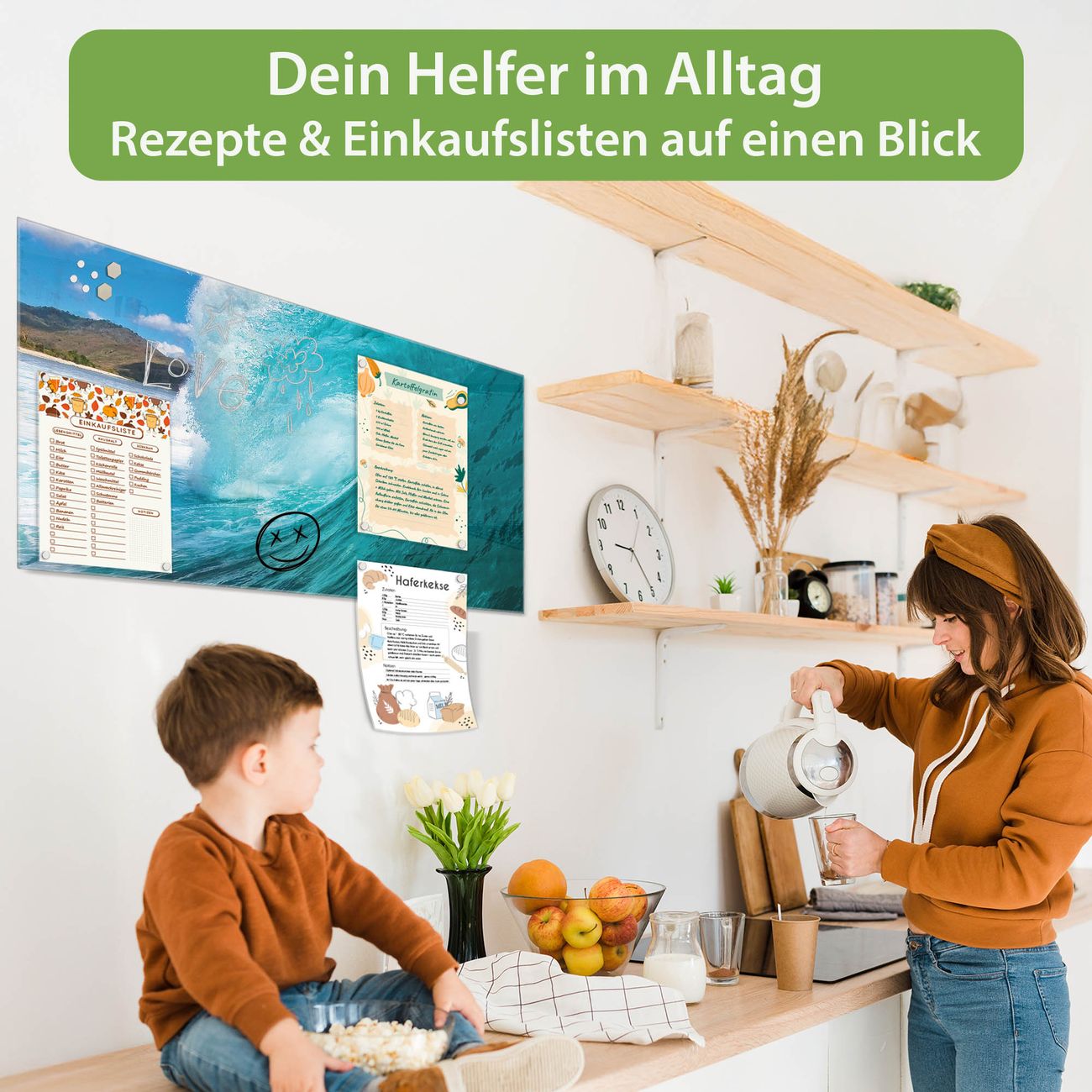 Ein Stück Design, das Ihren Alltag organisiert. Schreiben, heften, inspirieren - alles an einem Ort. Qualität, die man spürt. Montage leicht gemacht. Handwerk mit Herz - veredelt in Sachsen. Einzigartiges Design mit Motiv Motiv Perfekte Welle Beschreibbare Glasoberfläche, leicht zu reinigen Starke Magnetkraft durch Stahlrückwand Inklusive 4 Neodym-Magneten Flexible Montageoptionen Handveredelt in Sachsen - Qualität, die bleibt