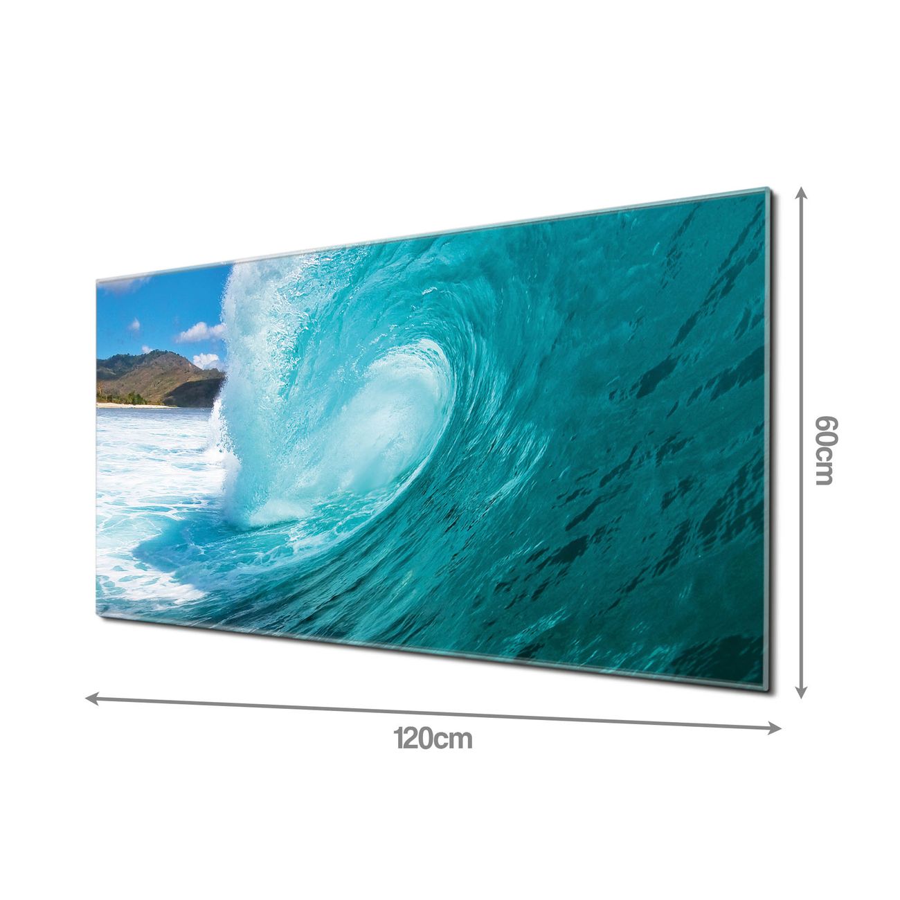 Material: 4mm Sicherheitsglas mit Metallrückwand Eigenschaften: beschreibbar, magnetisch, kratzfest Maße: 120x60x0,6cm, 10,80kg schwer Motiv Nummer 10096 Perfekte Welle Zubehör: inklusive 4 Neodym-Magnete