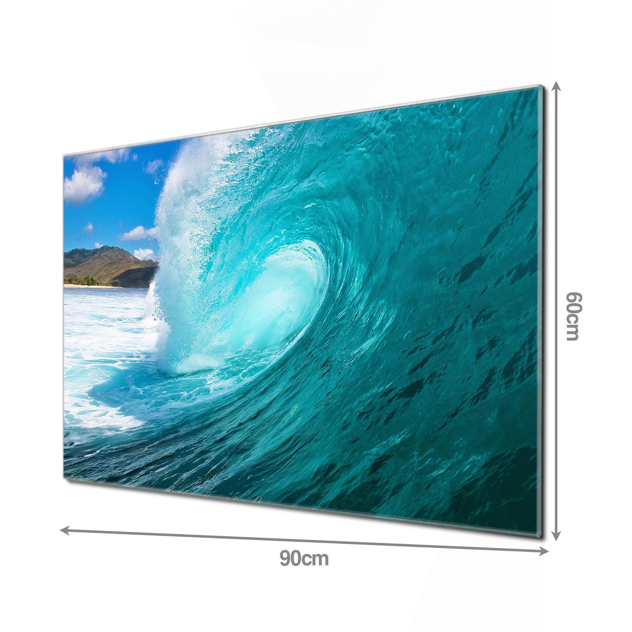 Material: 4mm Sicherheitsglas mit Metallrückwand Eigenschaften: beschreibbar, magnetisch, kratzfest Maße: 90x60x0,6cm, 8,10kg schwer Motiv Nummer 10096 Perfekte Welle Zubehör: inklusive 4 Neodym-Magnete