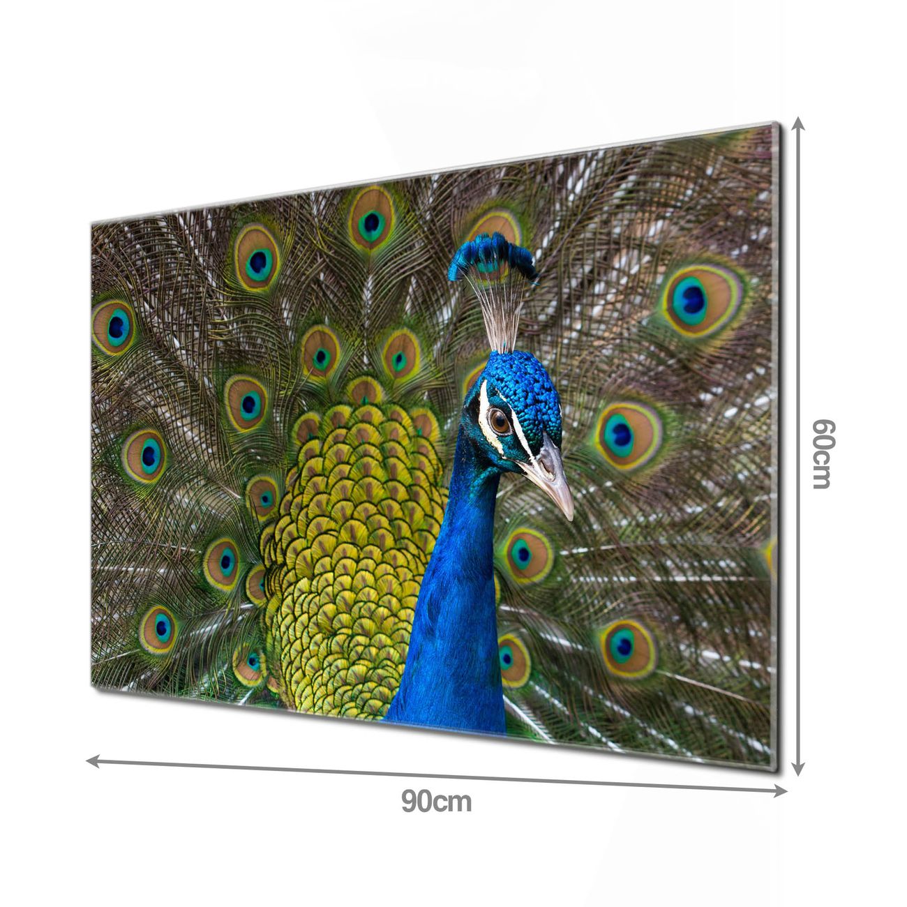 Material: 4mm Sicherheitsglas mit Metallrückwand Eigenschaften: beschreibbar, magnetisch, kratzfest Maße: 90x60x0,6cm, 8,10kg schwer Motiv Nummer 10500 Pfau Zubehör: inklusive 4 Neodym-Magnete