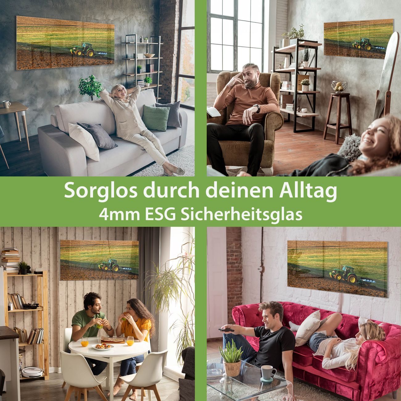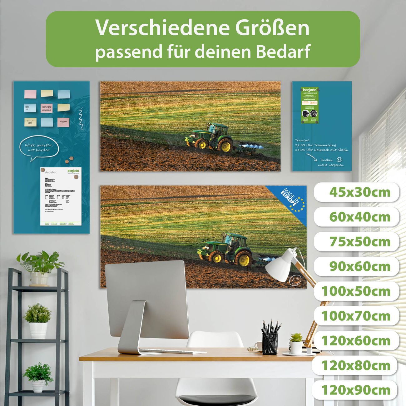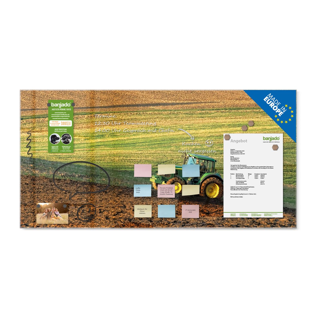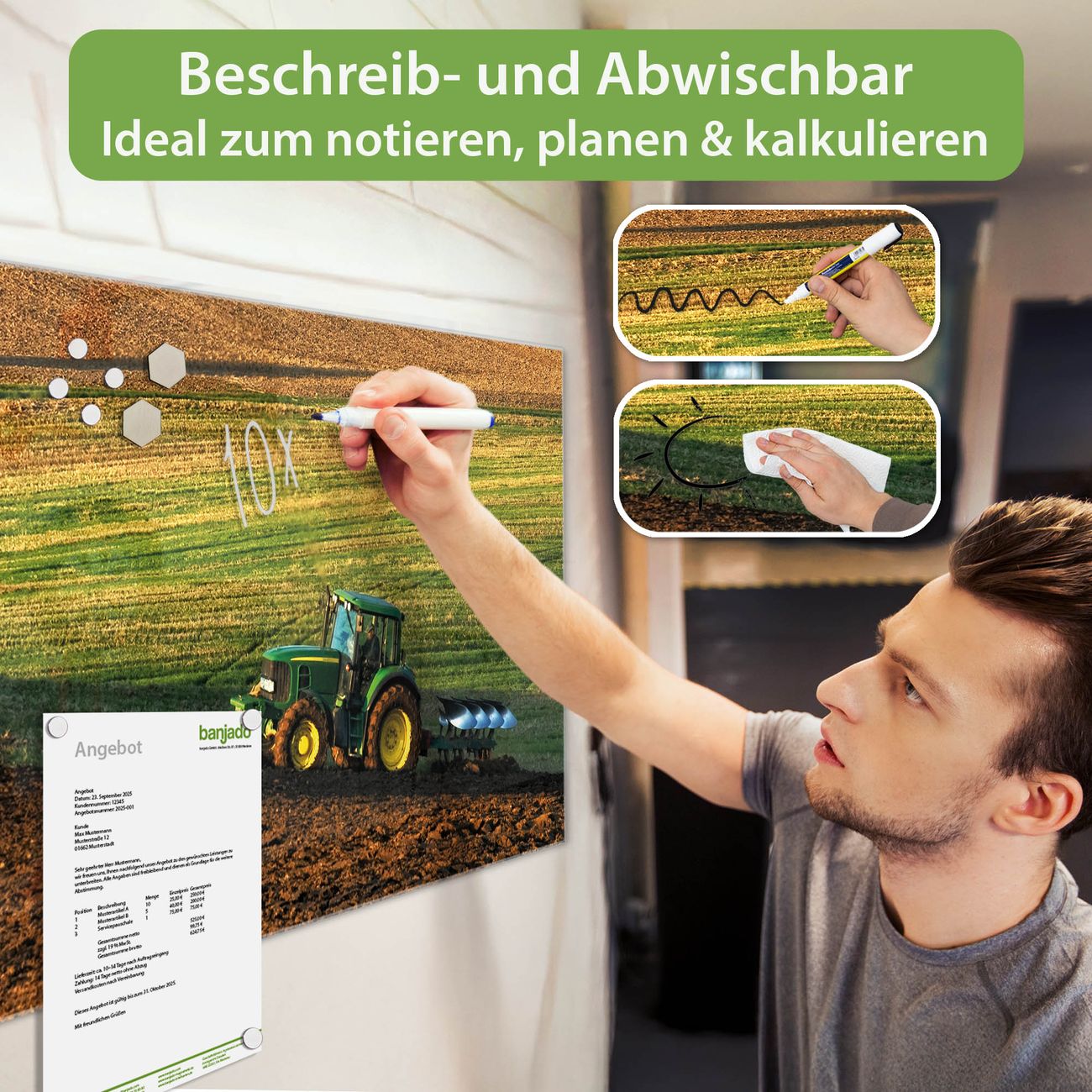 Material: 4mm Sicherheitsglas mit Metallrückwand Eigenschaften: beschreibbar, magnetisch, kratzfest Maße: 120x60x0,6cm, 10,80kg schwer Motiv Nummer 11207 Pflügen Zubehör: inklusive 4 Neodym-Magnete