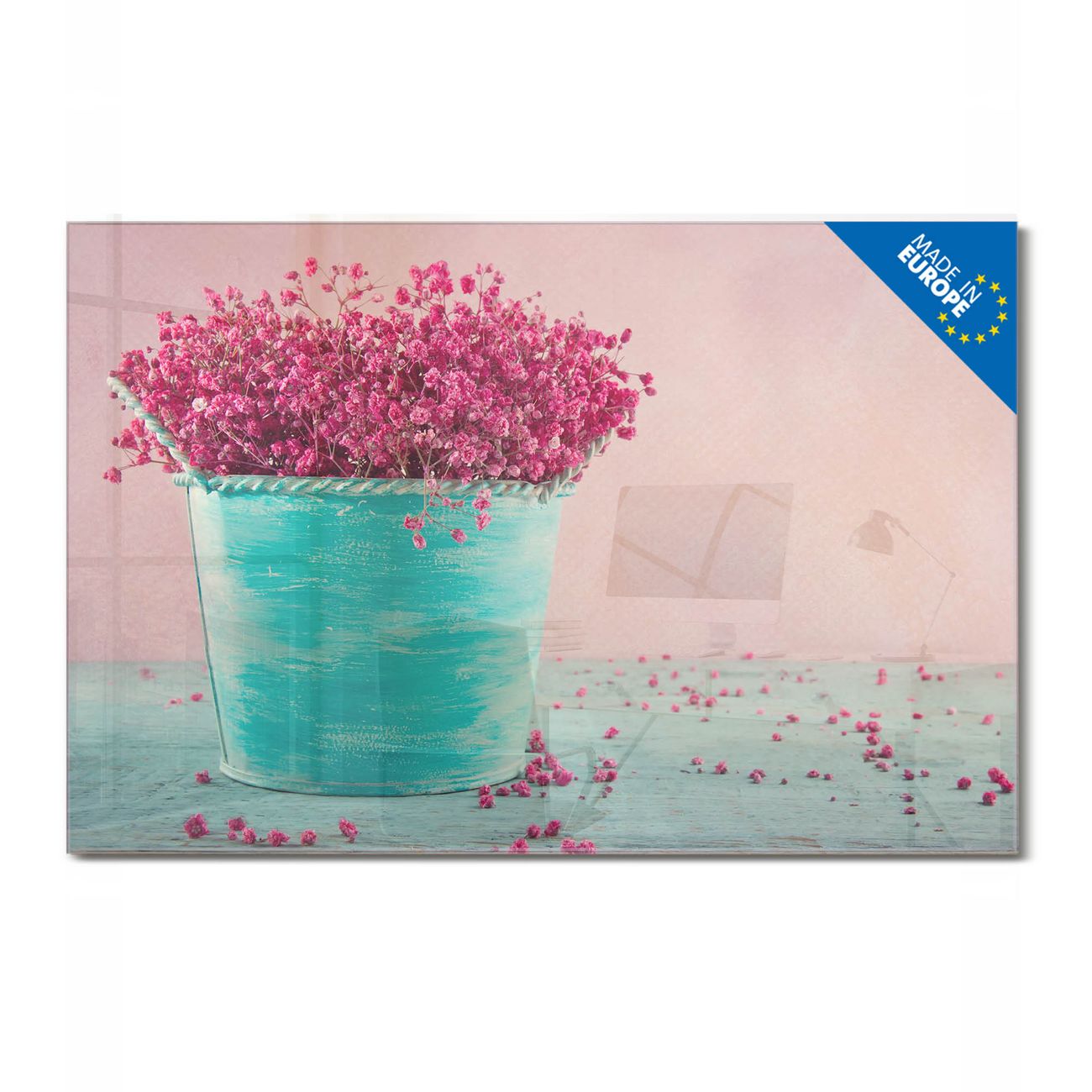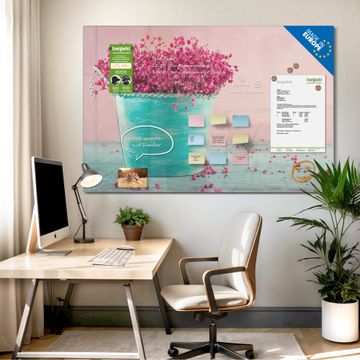 Material: 4mm Sicherheitsglas mit Metallrückwand Eigenschaften: beschreibbar, magnetisch, kratzfest Maße: 90x60x0,6cm, 8,10kg schwer Motiv Nummer 12662 Pinke Trockenblumen Zubehör: inklusive 4 Neodym-Magnete