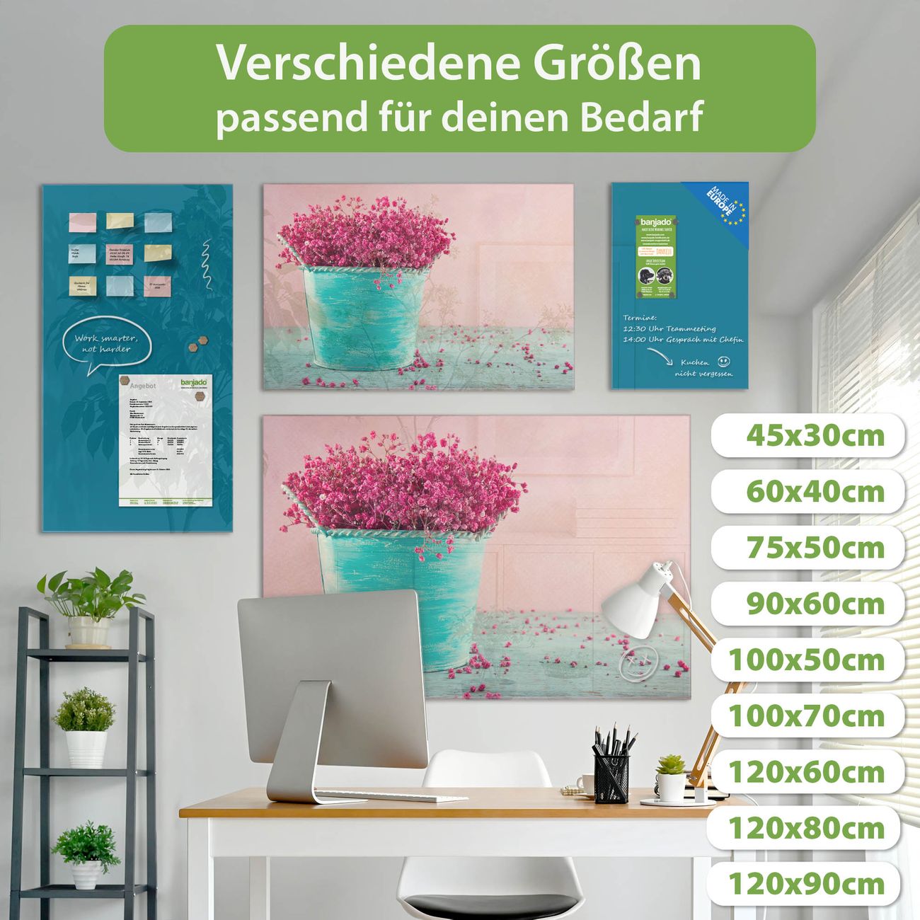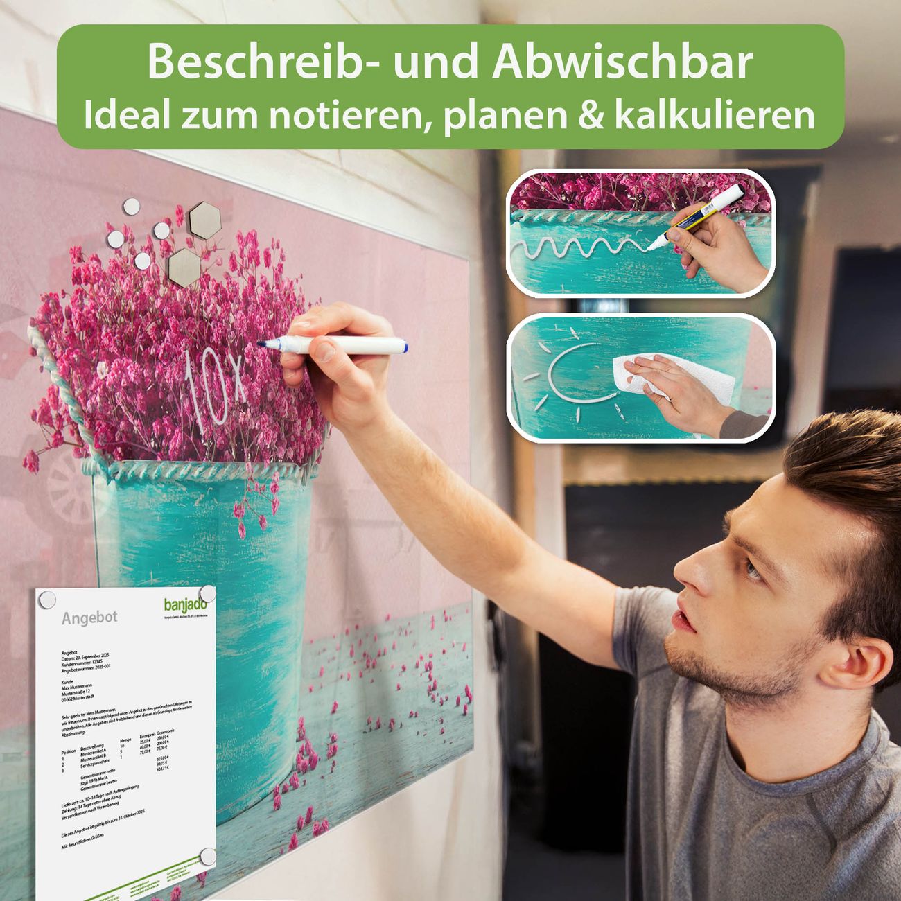 Jede Glas Magnettafel wird in unserer Werkstatt von Hand gefertigt und sorgfältig geprüft. So erhalten Sie ein echtes Qualitätsprodukt, das Funktion und Ästhetik perfekt vereint.?? Warum banjado?
