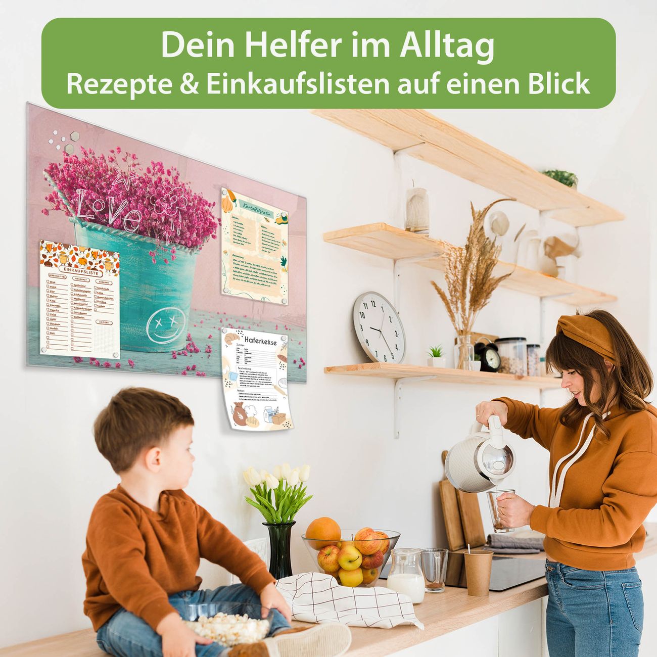 Auf der glatten Glasoberfläche lassen sich Termine, Rezepte oder Notizen ganz einfach mit Kreidestiften festhalten und rückstandslos entfernen. Starke Neodym-Magnete halten Ihre wichtigsten Erinnerungen sicher an Ort und Stelle. So entsteht Ihre ganz persönliche Ideenwand - jeden Tag neu.