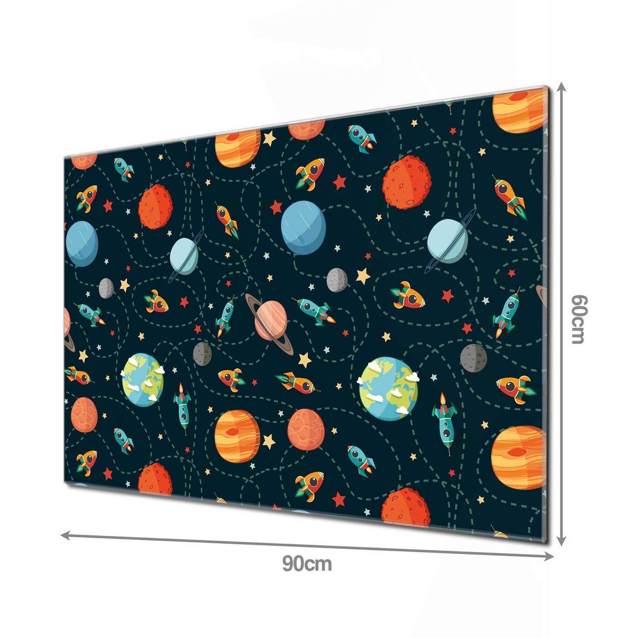 Material: 4mm Sicherheitsglas mit Metallrückwand Eigenschaften: beschreibbar, magnetisch, kratzfest Maße: 90x60x0,6cm, 8,10kg schwer Motiv Nummer 12233 Planet Cruiser Zubehör: inklusive 4 Neodym-Magnete