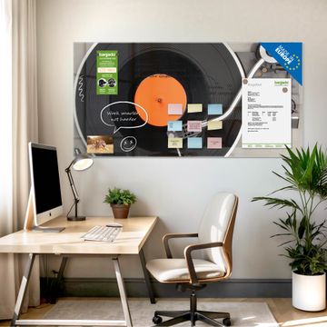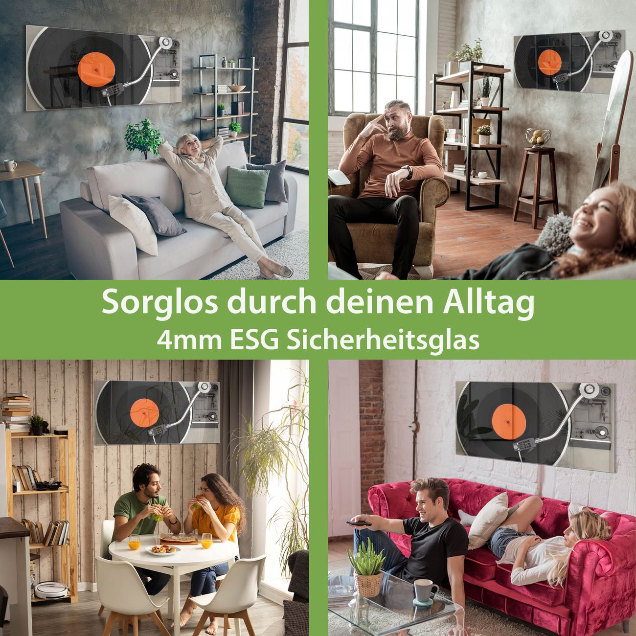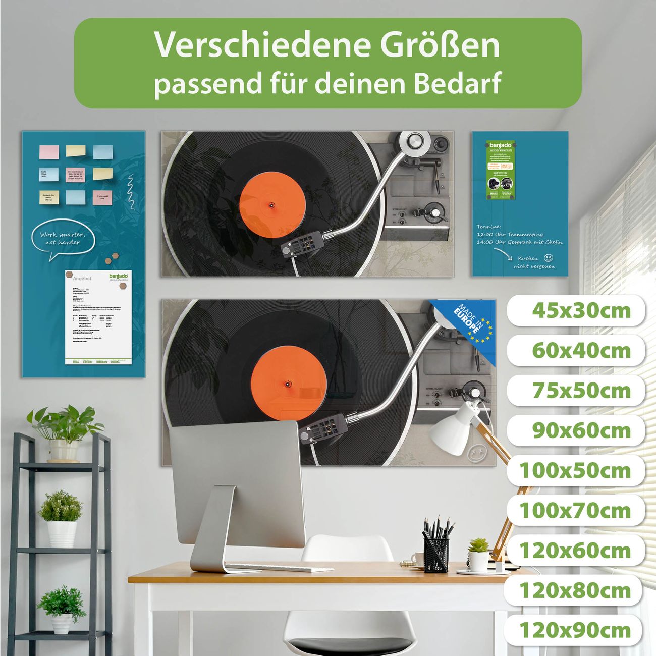 Material: 4mm Sicherheitsglas mit Metallrückwand Eigenschaften: beschreibbar, magnetisch, kratzfest Maße: 100x50x0,6cm, 7,50kg schwer Motiv Nummer 10269 Plattenspieler Zubehör: inklusive 4 Neodym-Magnete