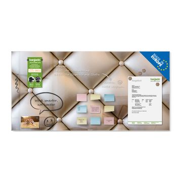 Material: 4mm Sicherheitsglas mit Metallrückwand Eigenschaften: beschreibbar, magnetisch, kratzfest Maße: 120x60x0,6cm, 10,80kg schwer Motiv Nummer 11984 Polster Bronze Zubehör: inklusive 4 Neodym-Magnete