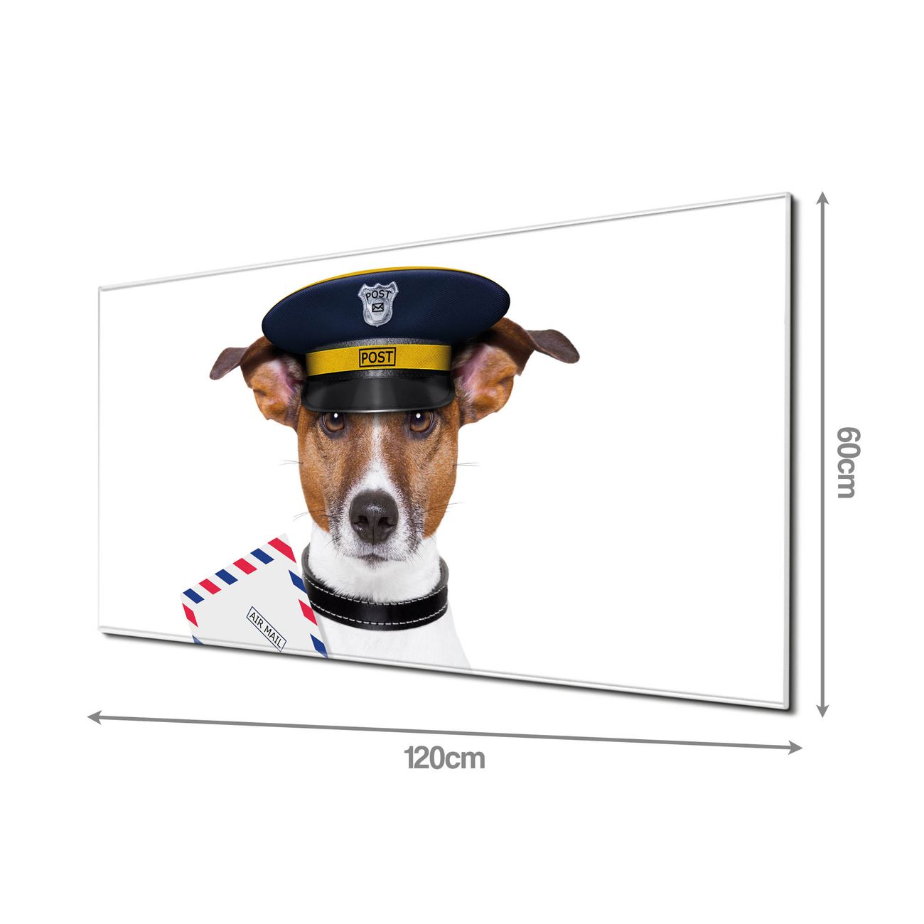 Material: 4mm Sicherheitsglas mit Metallrückwand Eigenschaften: beschreibbar, magnetisch, kratzfest Maße: 120x60x0,6cm, 10,80kg schwer Motiv Nummer 10474 Postbote Jack Russel Zubehör: inklusive 4 Neodym-Magnete
