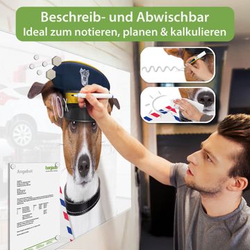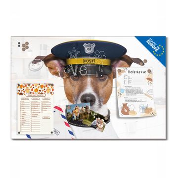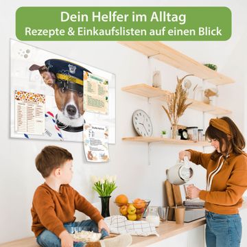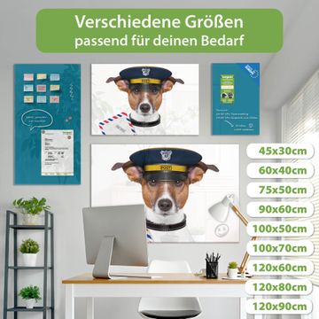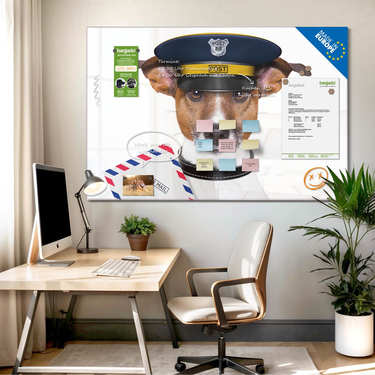 Material: 4mm Sicherheitsglas mit Metallrückwand Eigenschaften: beschreibbar, magnetisch, kratzfest Maße: 75x50x0,6cm, 5,63kg schwer Motiv Nummer 10474 Postbote Jack Russel Zubehör: inklusive 4 Neodym-Magnete