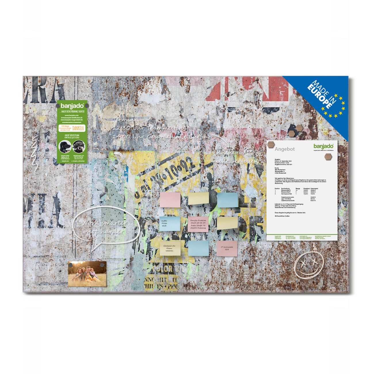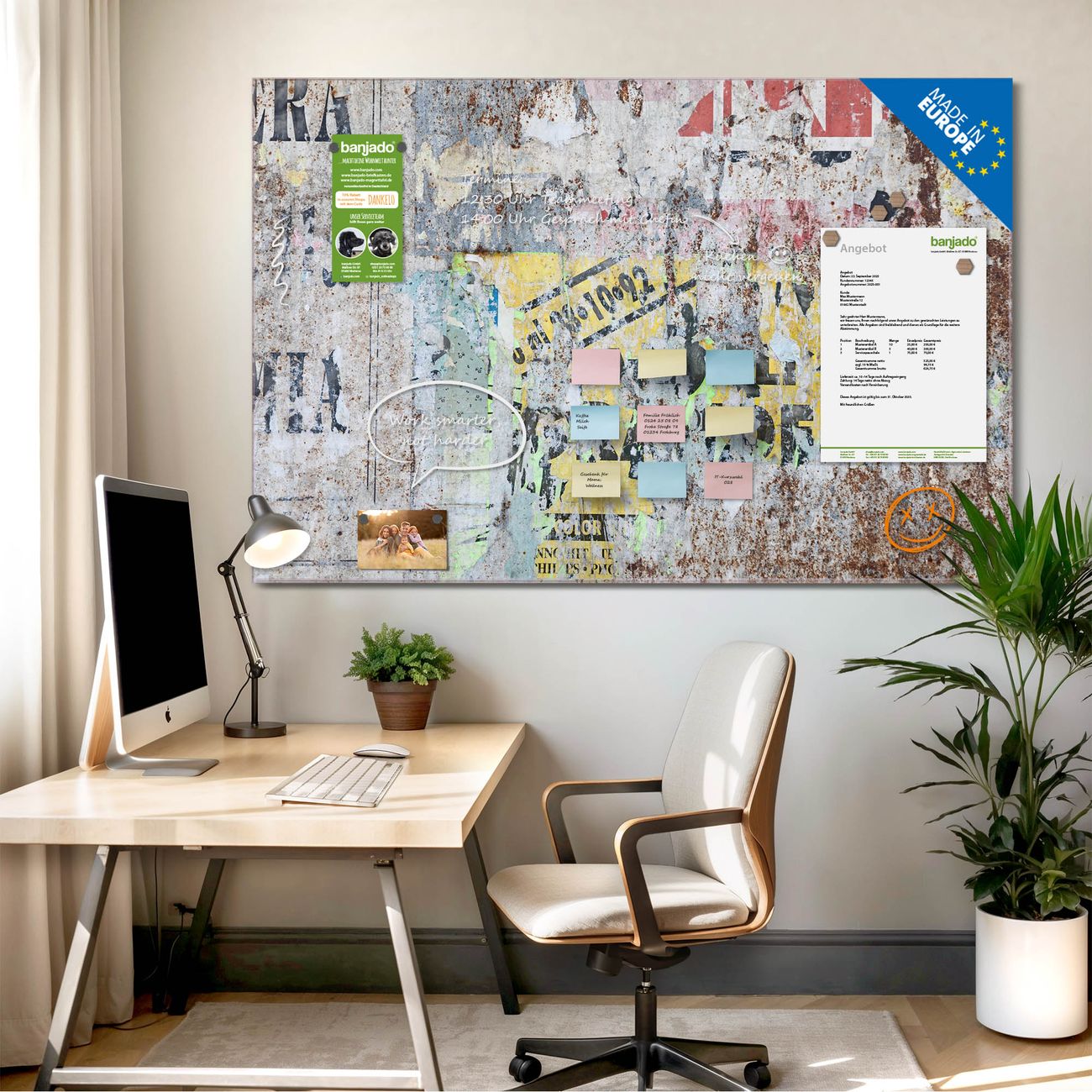 Jede Glas Magnettafel wird in unserer Werkstatt von Hand gefertigt und sorgfältig geprüft. So erhalten Sie ein echtes Qualitätsprodukt, das Funktion und Ästhetik perfekt vereint.?? Warum banjado?