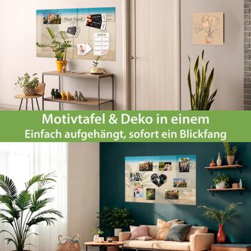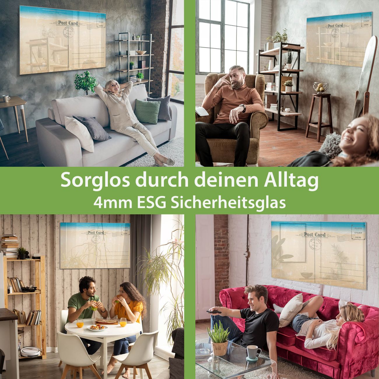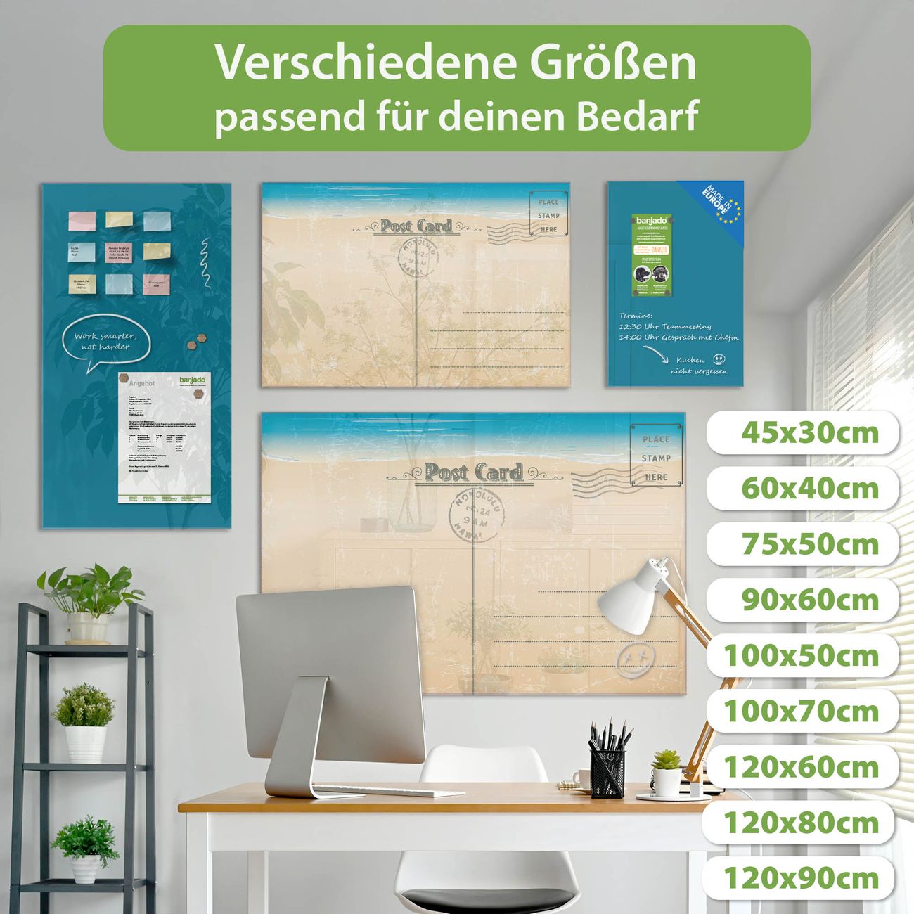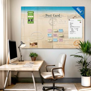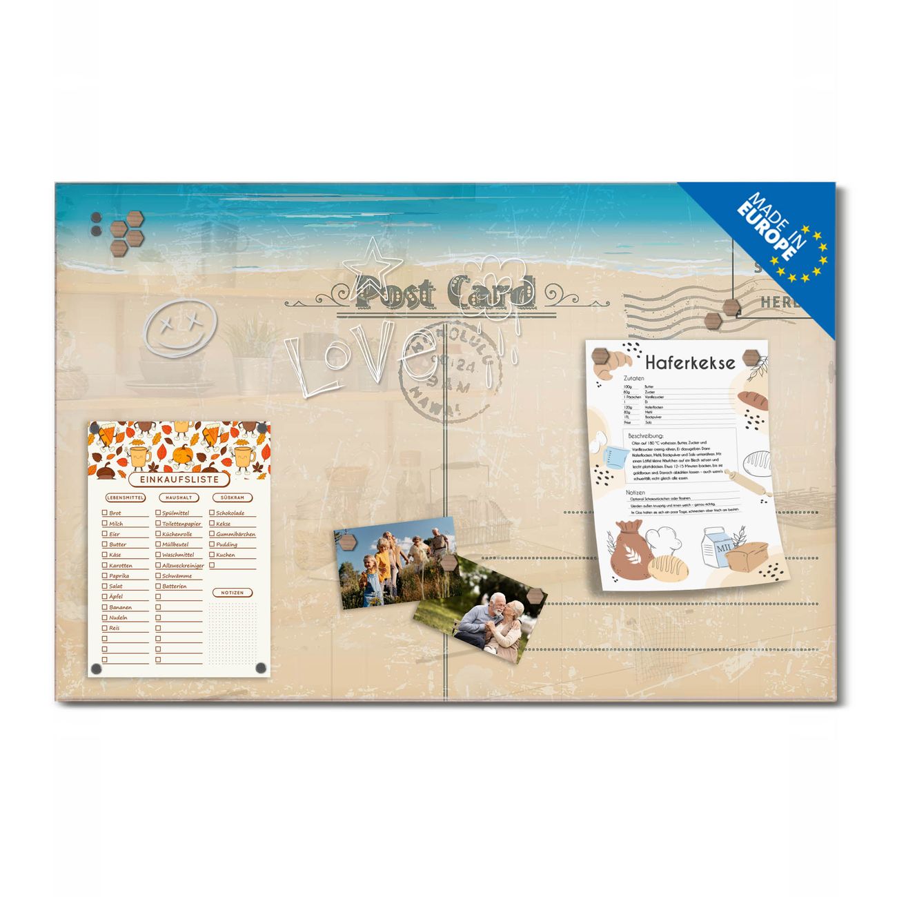 Material: 4mm Sicherheitsglas mit Metallrückwand Eigenschaften: beschreibbar, magnetisch, kratzfest Maße: 75x50x0,6cm, 5,63kg schwer Motiv Nummer 10316 Postkarte Zubehör: inklusive 4 Neodym-Magnete