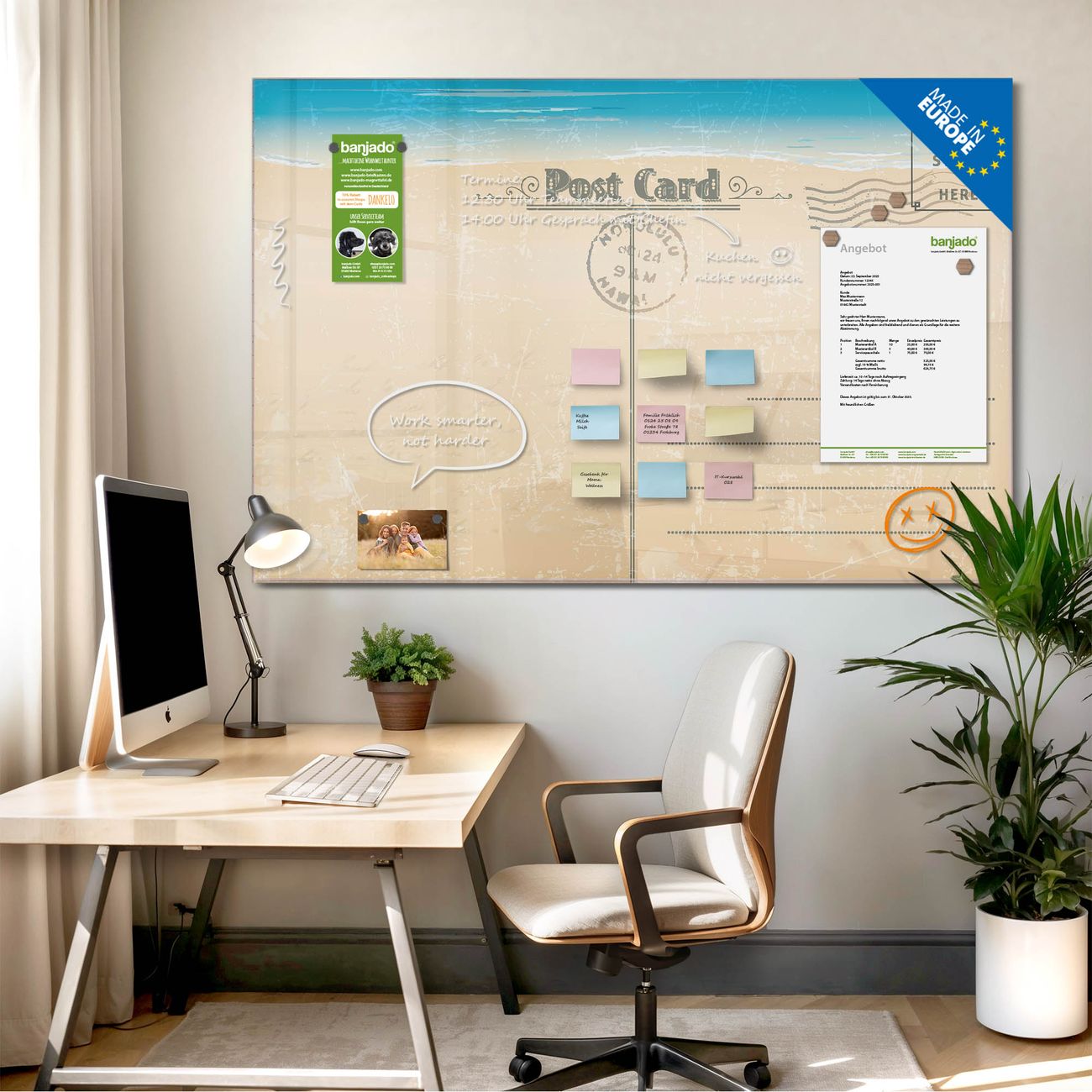Die banjado Glas Magnettafel mit dem Motiv Motiv Postkarte verbindet Funktionalität mit Stil. Sie ersetzt das Zettelchaos durch klare Strukturen und bringt dabei eine warme, natürliche Atmosphäre in Ihr Zuhause. Ob im Büro, in der Küche oder im Eingangsbereich - dieses Design-Board zieht Blicke an und sorgt für Ordnung mit Charakter.