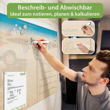 Auf der glatten Glasoberfläche lassen sich Termine, Rezepte oder Notizen ganz einfach mit Kreidestiften festhalten und rückstandslos entfernen. Starke Neodym-Magnete halten Ihre wichtigsten Erinnerungen sicher an Ort und Stelle. So entsteht Ihre ganz persönliche Ideenwand - jeden Tag neu.