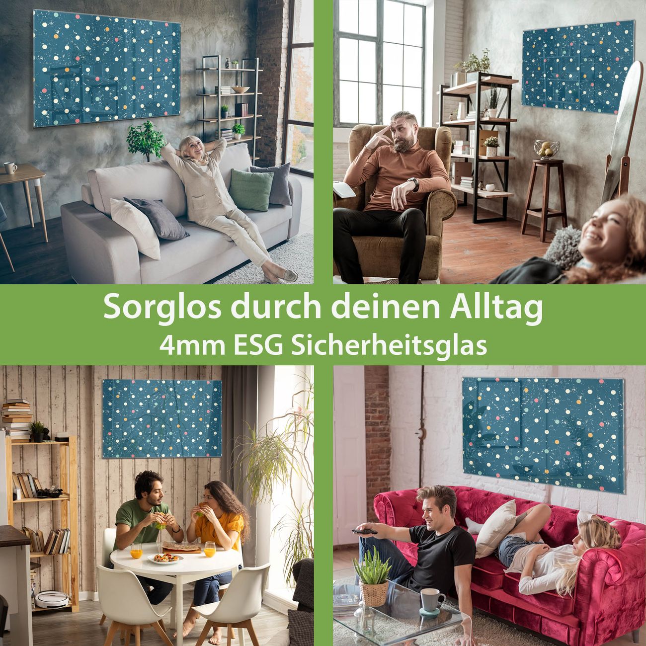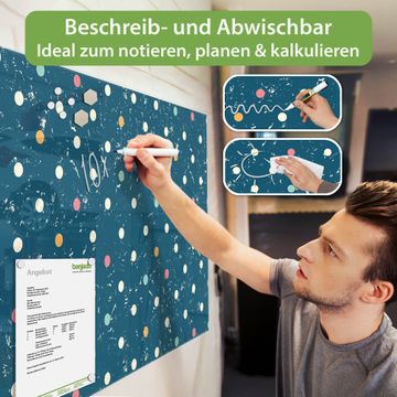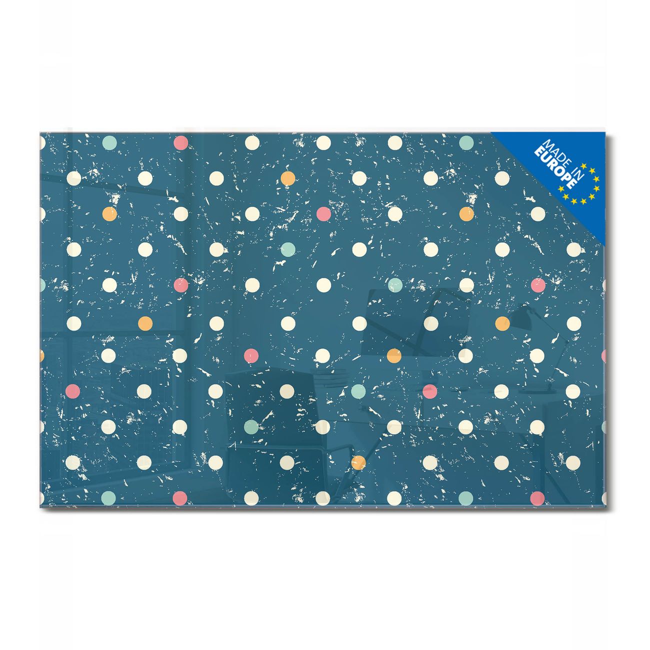Material: 4mm Sicherheitsglas mit Metallrückwand Eigenschaften: beschreibbar, magnetisch, kratzfest Maße: 120x80x0,6cm, 14,40kg schwer Motiv Nummer 11681 Punkte auf Blau Zubehör: inklusive 4 Neodym-Magnete