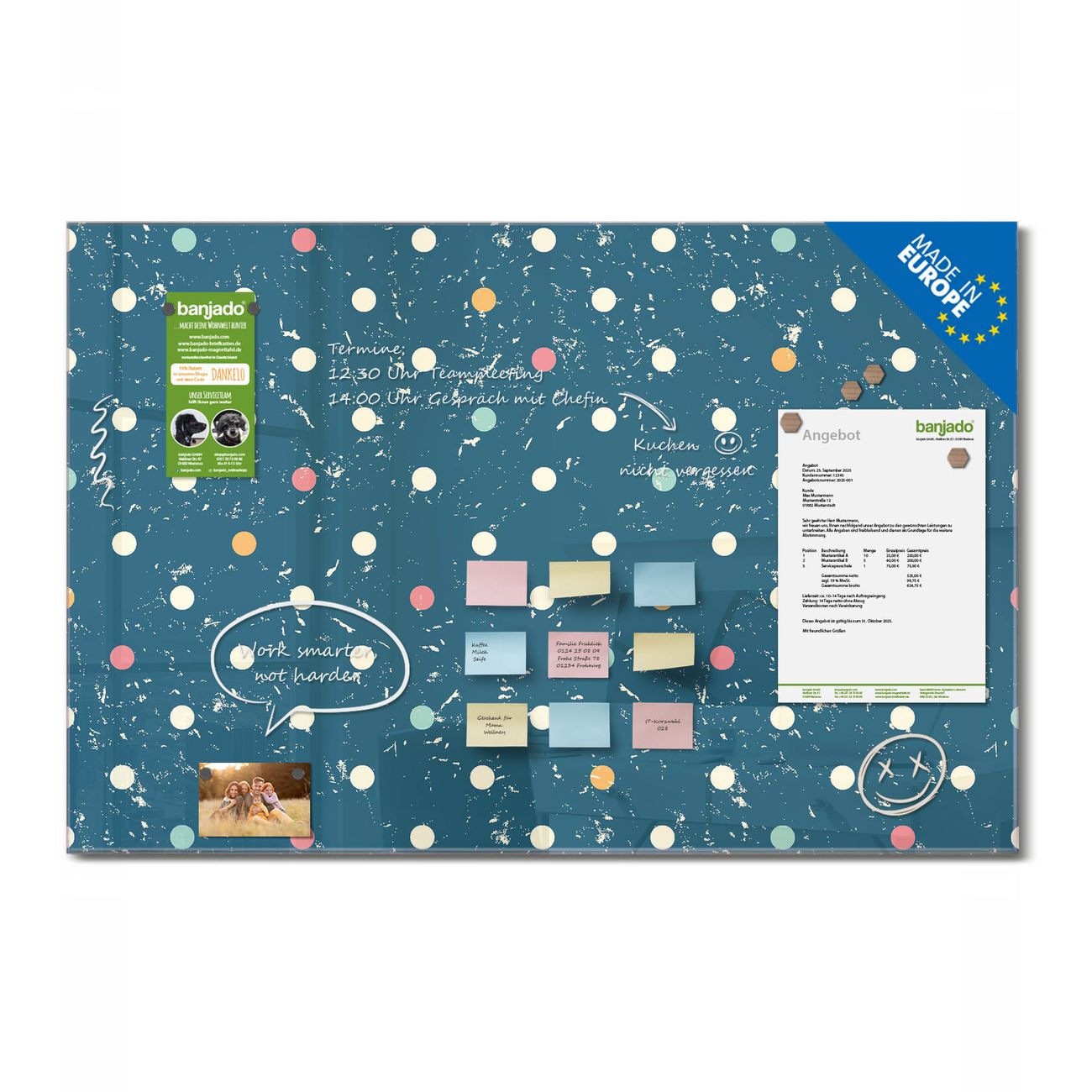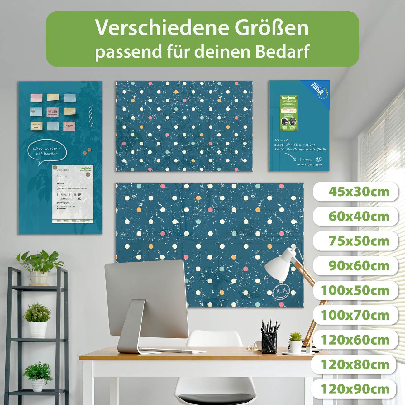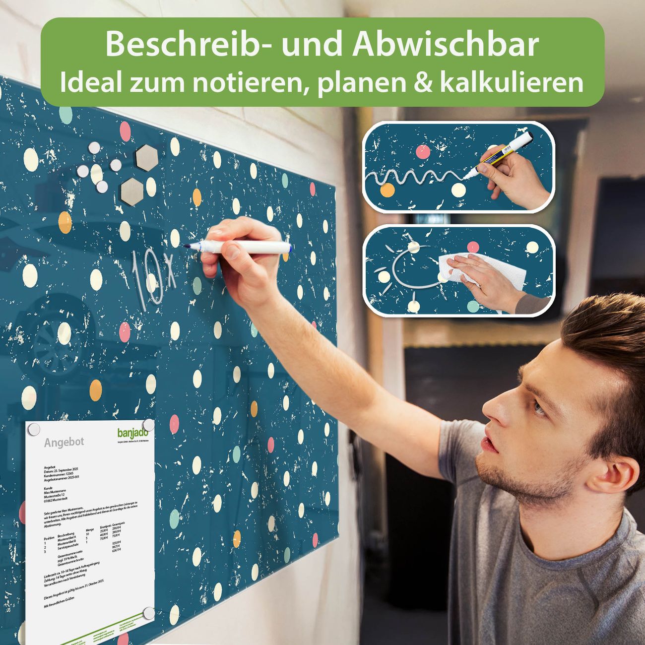 Jede Glas Magnettafel wird in unserer Werkstatt von Hand gefertigt und sorgfältig geprüft. So erhalten Sie ein echtes Qualitätsprodukt, das Funktion und Ästhetik perfekt vereint.?? Warum banjado?